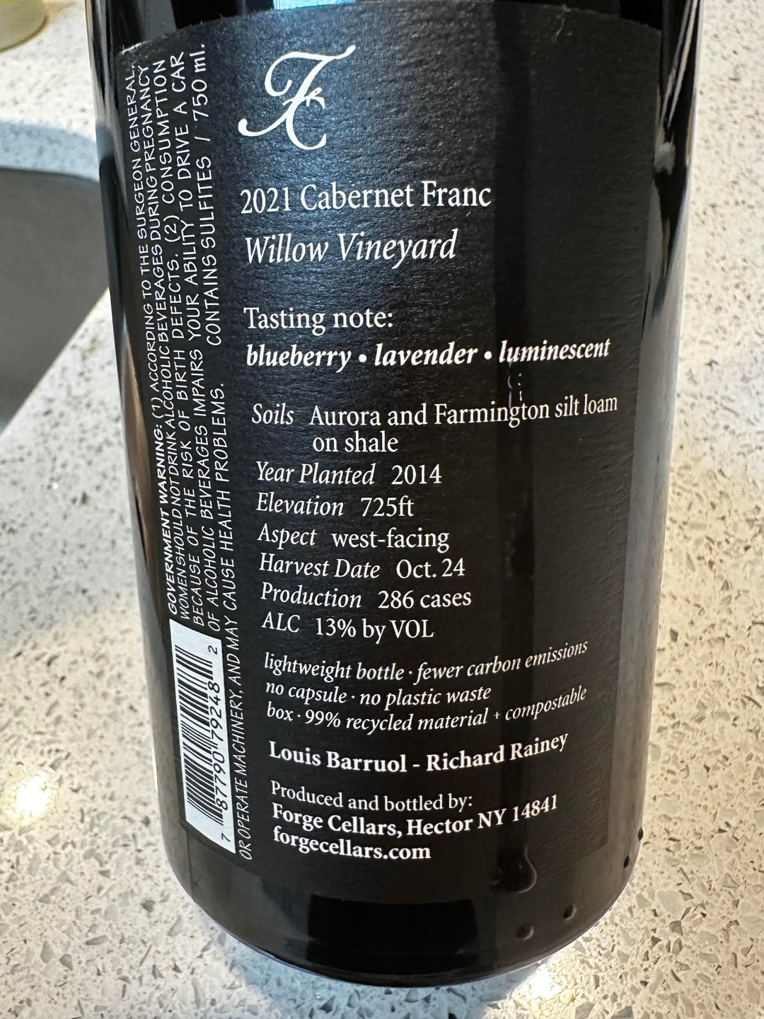 Forge cellars cab franc 2021, received on sale for $21. avg price says $27 on Wine searcher, $37 on Vivino