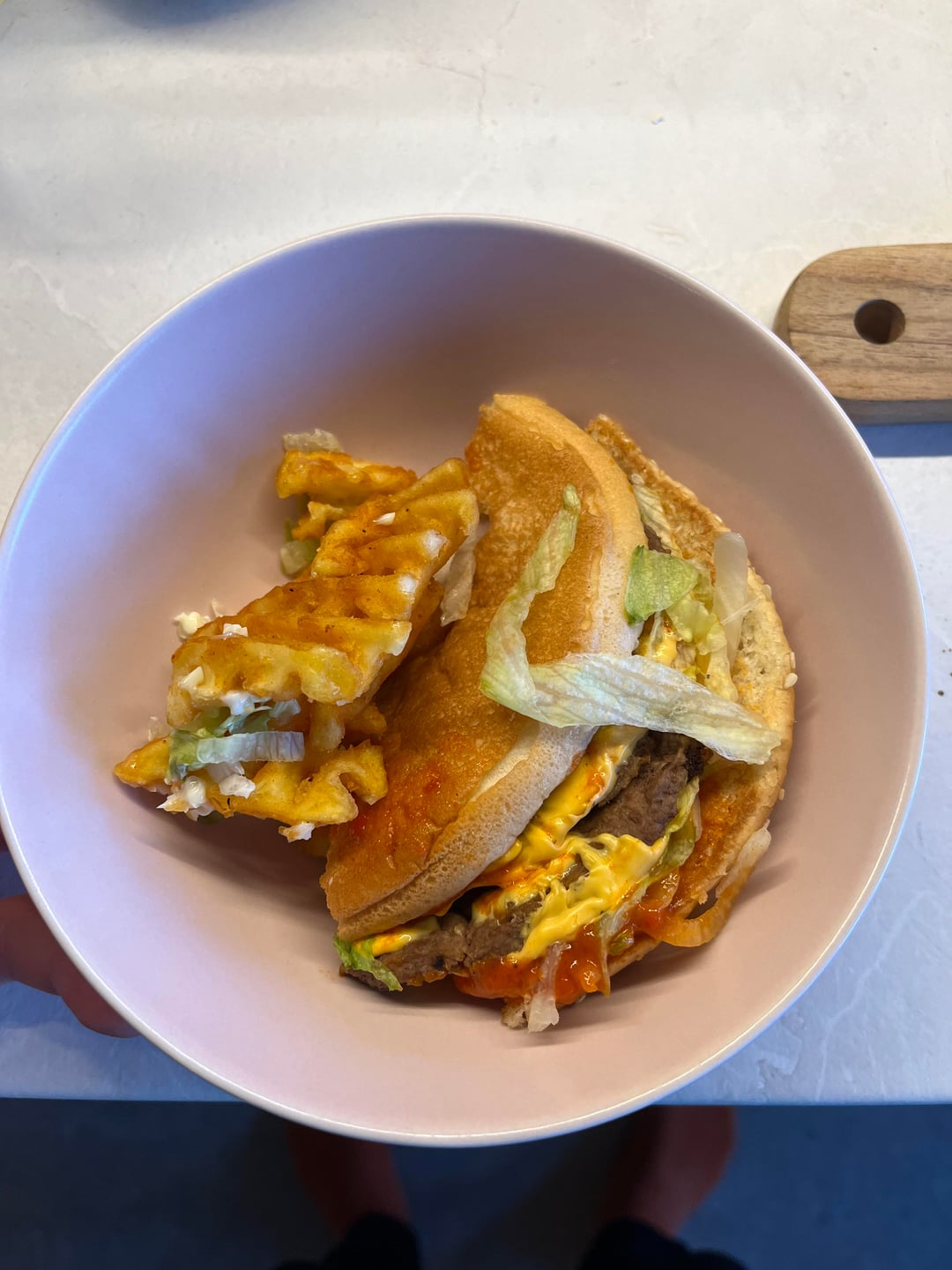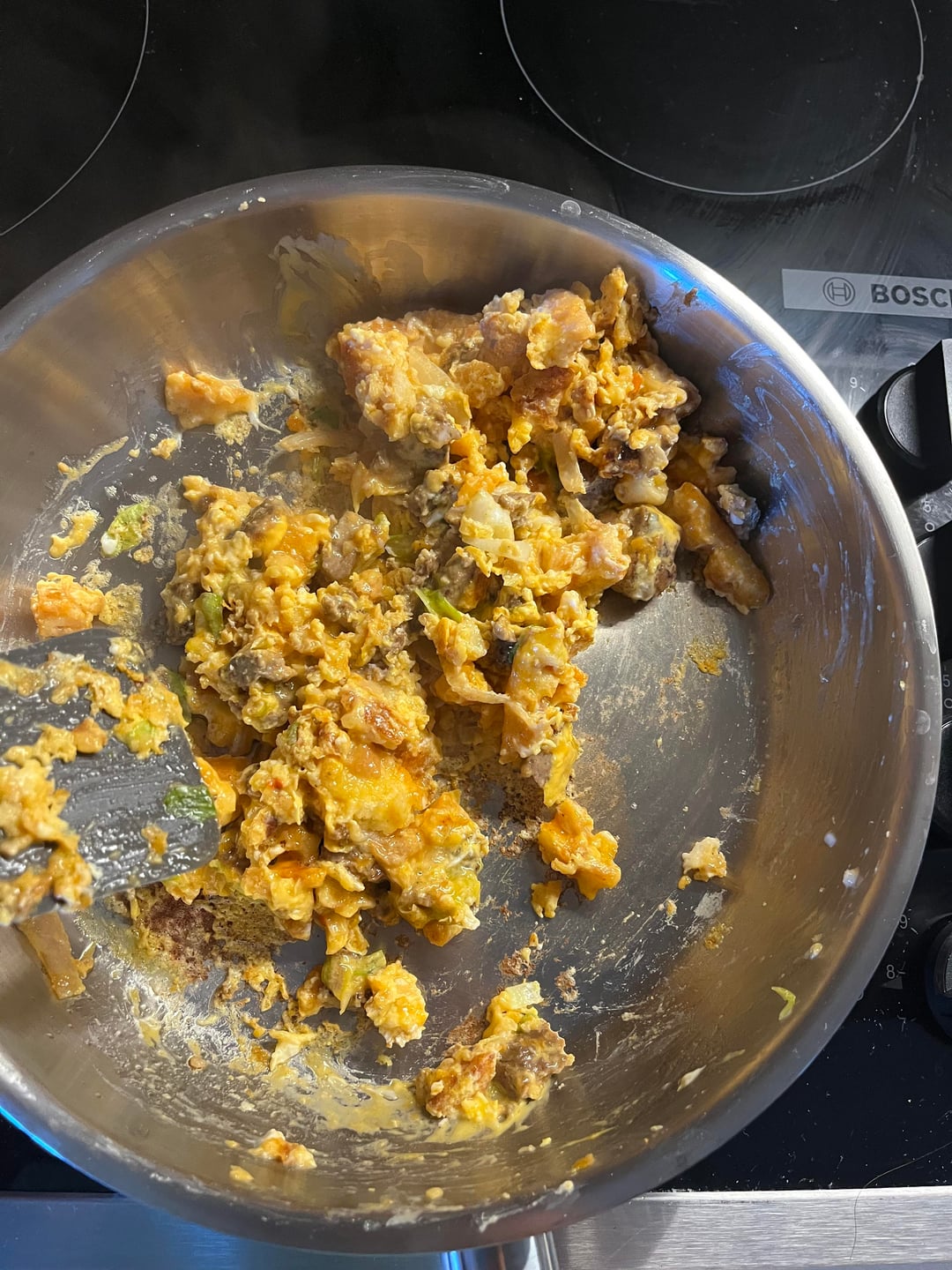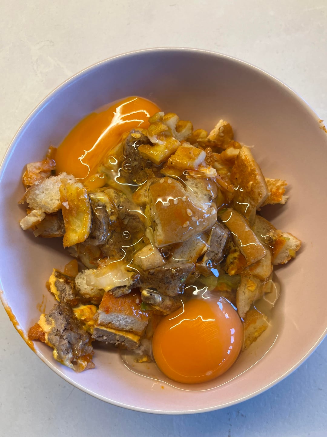 Some leftover burger directly from the fridge mixed with two eggs, resulting in a textural paradox tasting of forbidden, joyous salvation.
