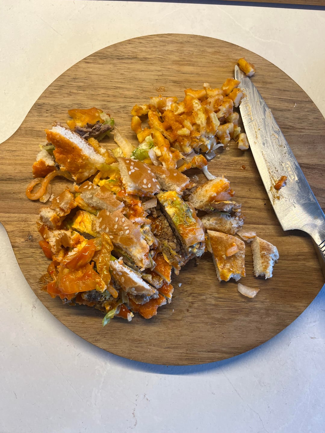 How do you even come up with this lmao. Could have just put a cooked egg in the bun but instead you spend time to cut it all up and come up with sauteed burger egg paste