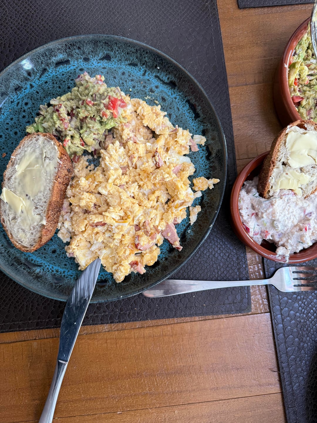 Scrabbled eggs with ham and cheese & guacamole 🥑 and spring cottage cheese with radish and red pepper 🌶️by Jolabaz Dining and Cooking