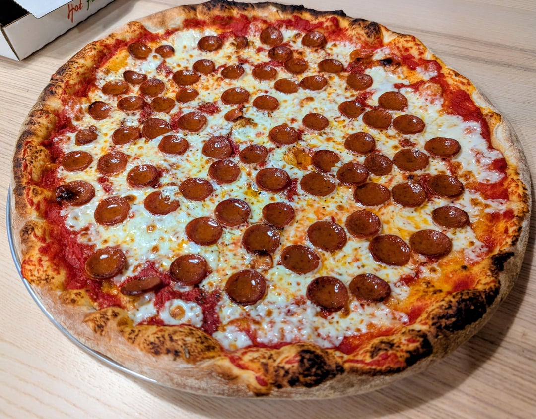 Something about putting it in a box makes it even more fun even if I delivered it from my garage to my kitchen table. Bought some 18" pizza boxes (can't find 20" ones) so I can bring pizza to friends and neighbors. 18" WMLM Cheese and an 18" Cupped Pepperoni with WMLM. 72 hour cold ferment.