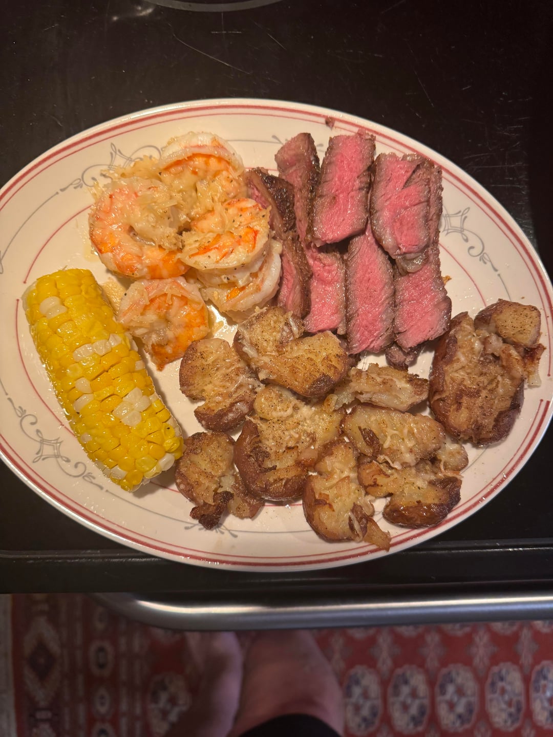 Grilled ribeye and then pan seared. Fresh corn, garlic and butter seared shrimp and garlic roasted smashed potato’s.by Realistic-Fact-2584 3 Comments DifficultElk5474 5 days ago Looks perfect! MagazineDelicious151 5 days ago Looks fantastic. ibizafool 4 days ago please make me a plate 🙏