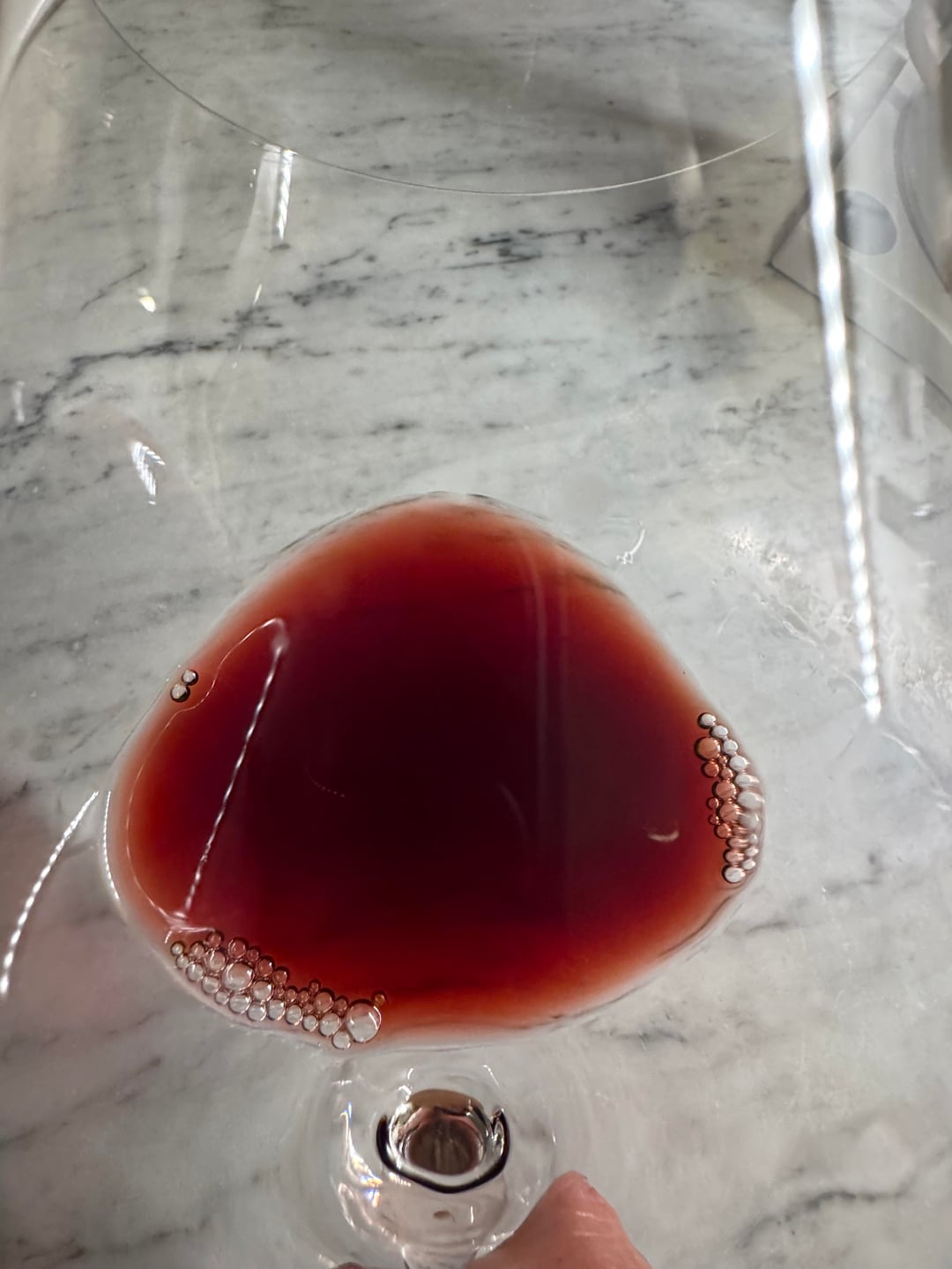 Tons of complexity. Med + aromas of dried cherry, also sour cherry, dried raspberry, dried strawberry, iris, forest floor, tree bark, tar, espresso, tobacco, leather, toasted cedar, and graphite.