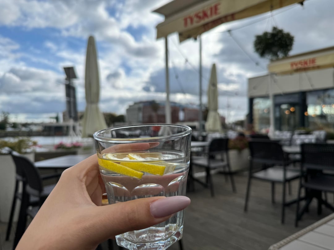 Pizza with burrata, tomatoes, arugula, smoked meats, red onion, and a side of lemon water – because balance, right? πŸ˜‚