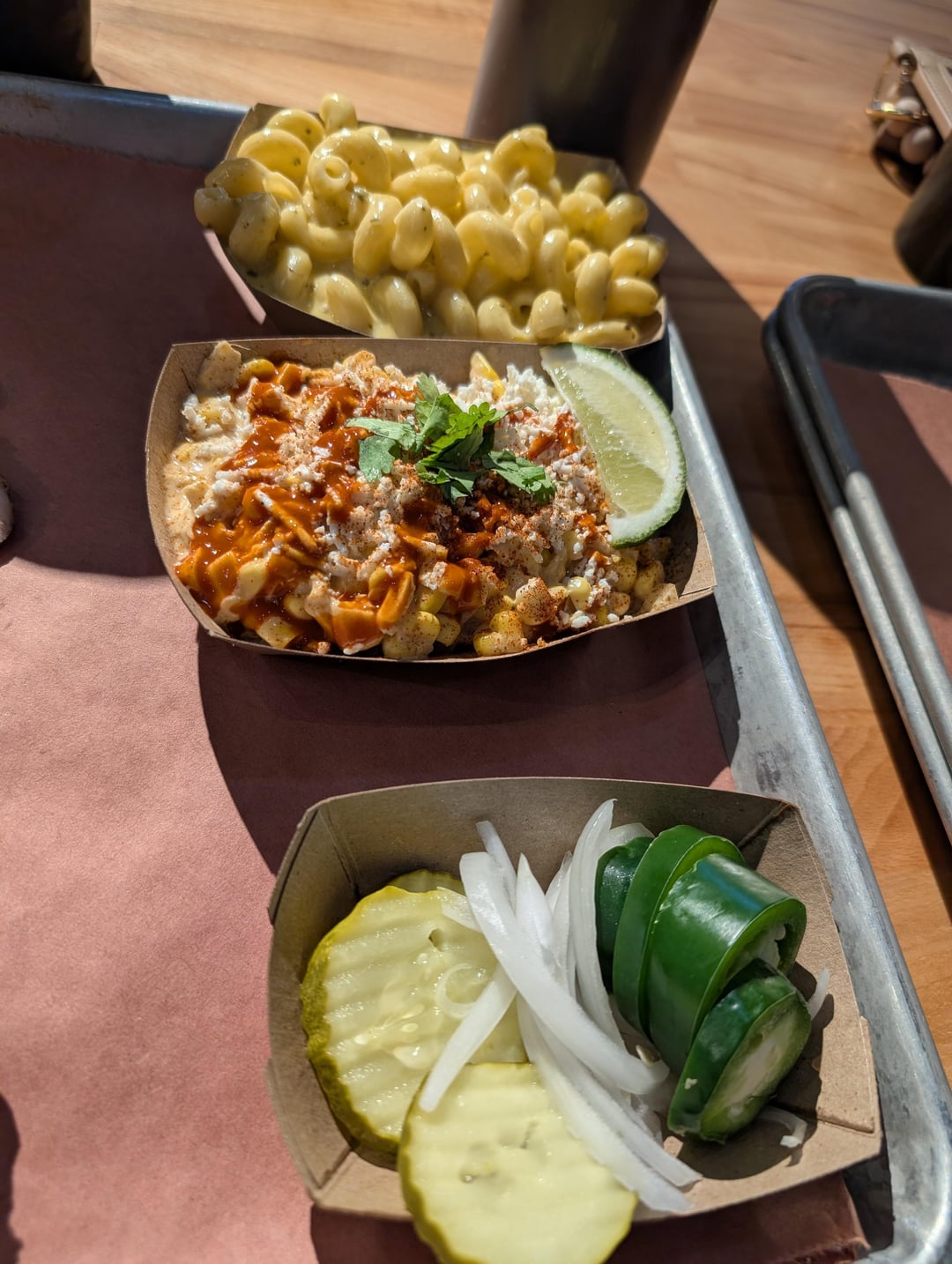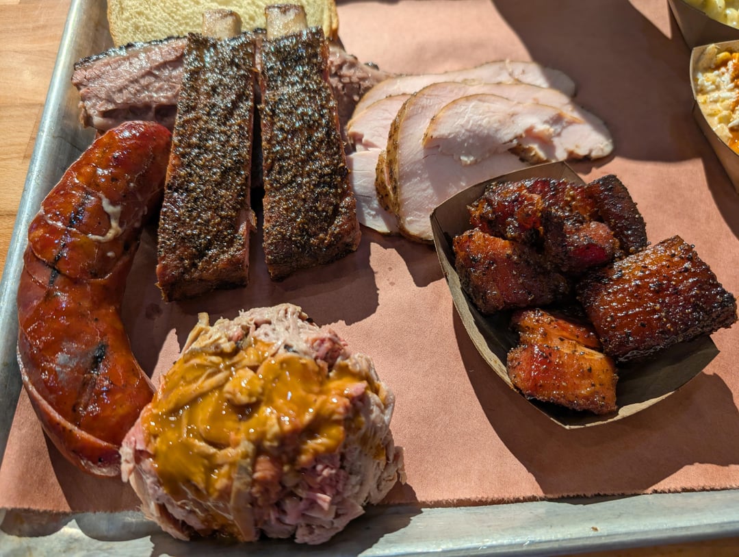 Brisket, pulled pork, spare ribs, turkey, sausage, and pork belly burnt ends. Sides were green Chile Mac n cheese and Mexican street corn.