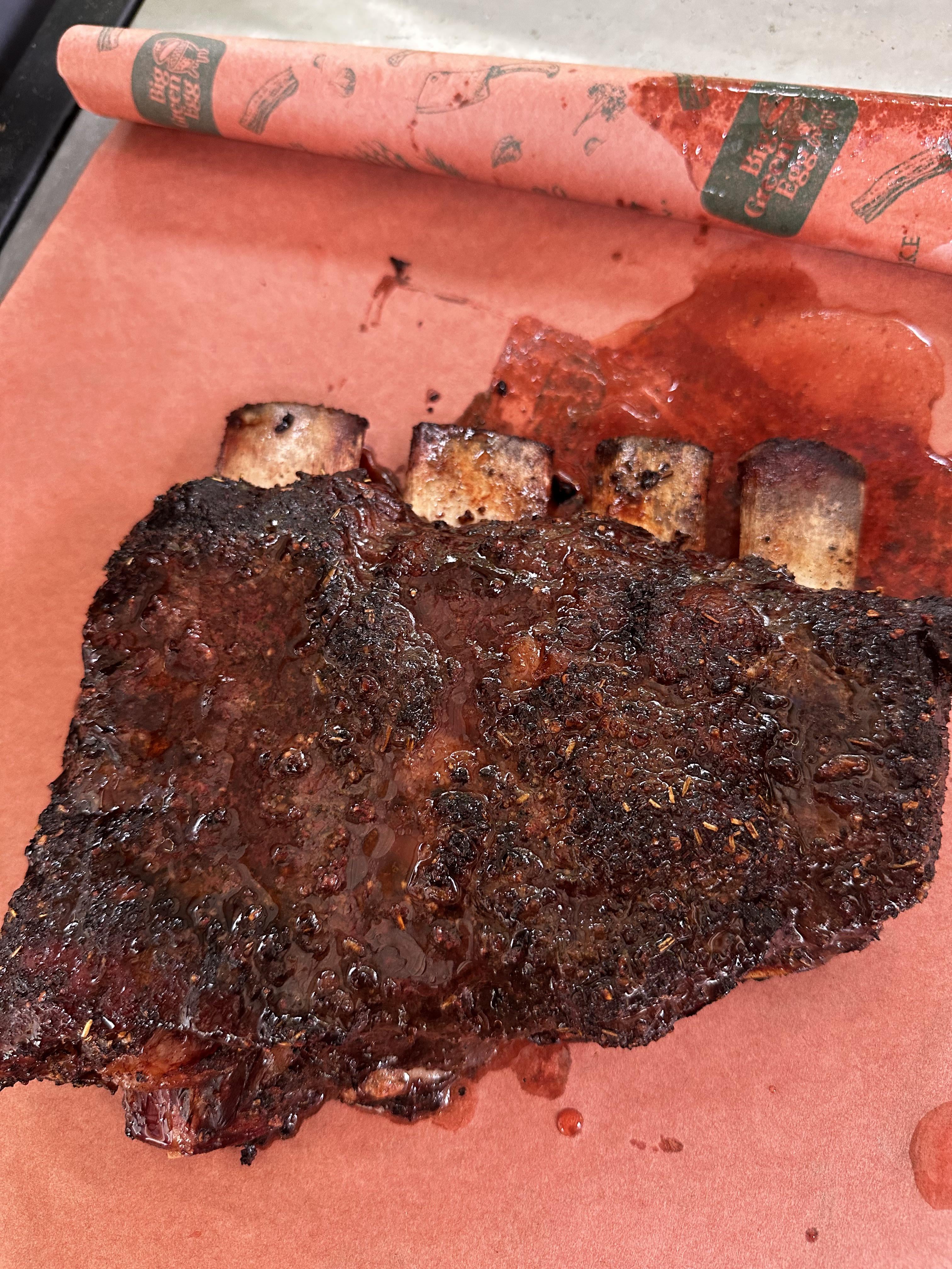 Smoked on my BIg green egg for two hours wrapped with red wine in a butcher paper for one hour and then cooked open for another hour, they were tender, juicy, and delicious