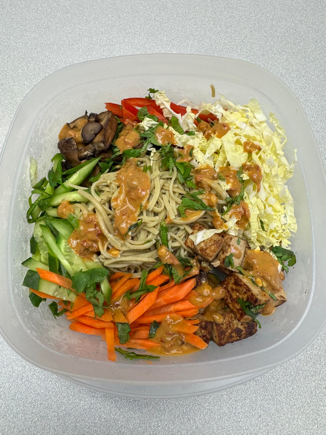 I made a cold noodle bowl with a peanut sauce using edamame spaghetti, carrots, tofu, mushrooms, cucumber, red bell pepper, Napa cabbage, and some cilantro.