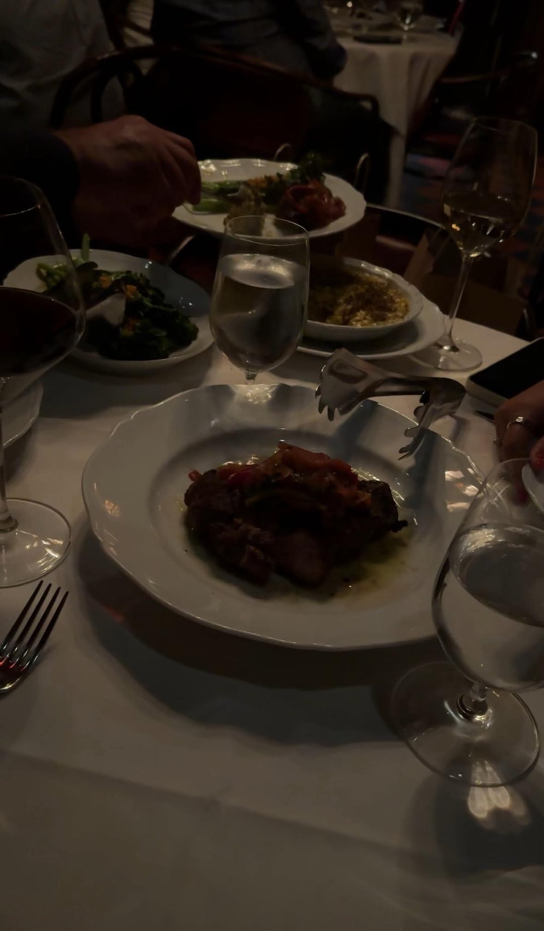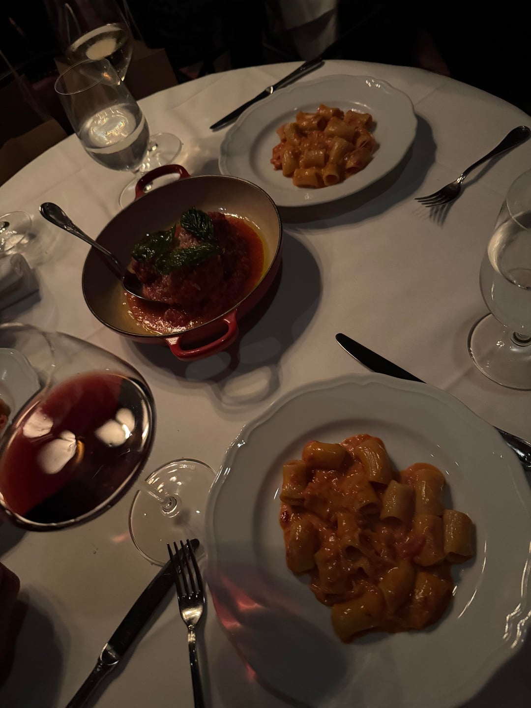 We had the burrata with caviar, baked clams, some raw fish situation, the spicy rigatoni, the meatballs, pork chops, broccolini, corn and the tiramisu. The appetizers and pasta were amazing. Great ingredients, well cooked, no complaints. The pork chops and veggies sides, however, were mediocre. They were very simply seasoned but the meat was too slowly cooked and not long enough, it was tough and dry. Corn was extremely truffle heavy and not in a good way. The broccolini was burned. Amazing liquor and wine menu, though, and my drinks were all made to perfection.