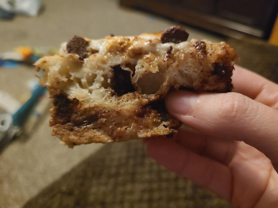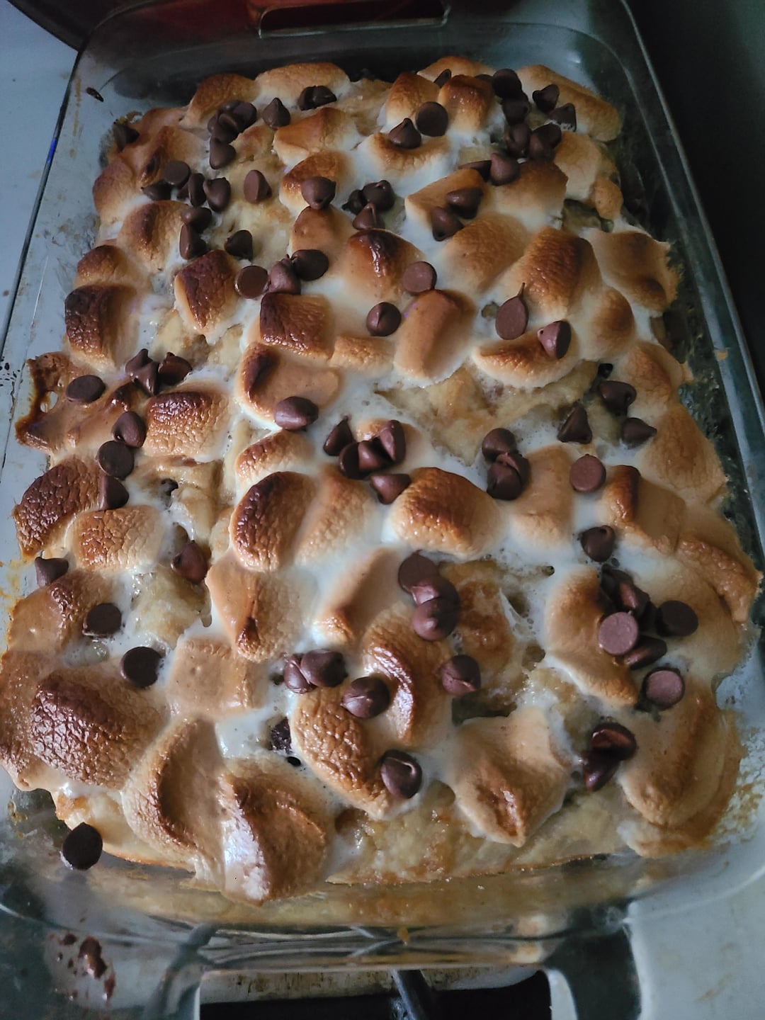 I used https://alexandracooks.com/web-stories/the-best-and-easiest-overnight-focaccia/ as the base recipe. When I took the dough out of the fridge, I flattened it (using my fingertips) in a buttered 9×13" glass baking dish. I covered it in semisweet chocolate chips and marshmallows (large ones quartered). I folded it into 3rds length wise, then again width wise. I stuck it in my oven (slightly warmed since it was a cooler day). Once it had time to rise (about 3 hours) I drizzled with olive oil, sprinkled on a little kosher salt, and then some light brown sugar and proceeded to dimple it. I baked it woth my oven set to 450⁰F (no idea what the actual temp was because my oven is dying.. a thermometer doesn't help, because the temp fluctuates the entire time). About 18 minutes into the bake, I stuck more marshmallows on top, sticking them to the melted brown sugar. I baked until the marshmallows were toasty, but not burned. In the last couple of minutes in the oven, I sprinkled on more chocolate chips. I let it cool for about 30 minutes before cutting into it… it was sticky, sweet, gooey, and delicious!