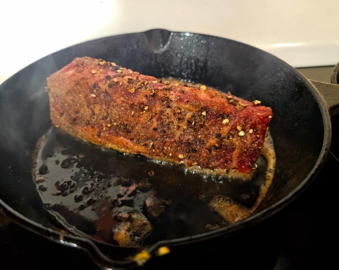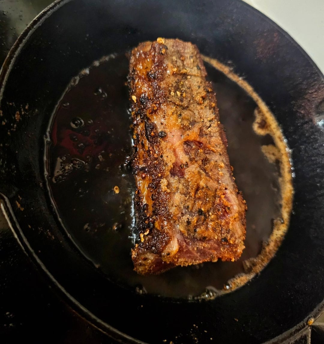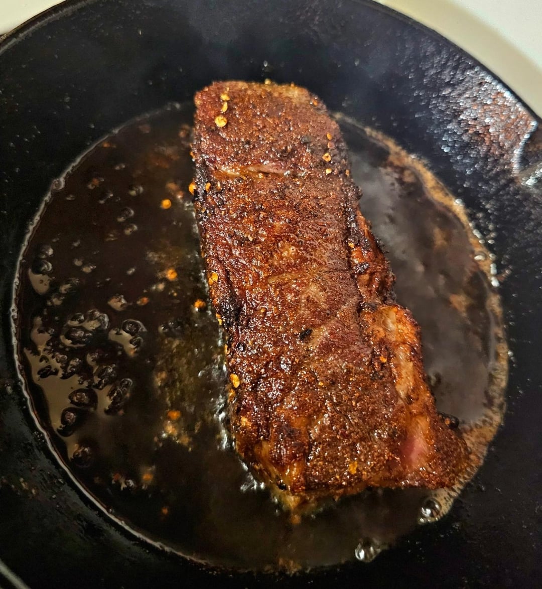 SPPOG rub a steak, start it in a warm pan with the fat edge down, and turn up the heat. When it starts to sizzle, sear the rest of it. I like it rare and at this point it’s done for me 😂 cook it to your preference.