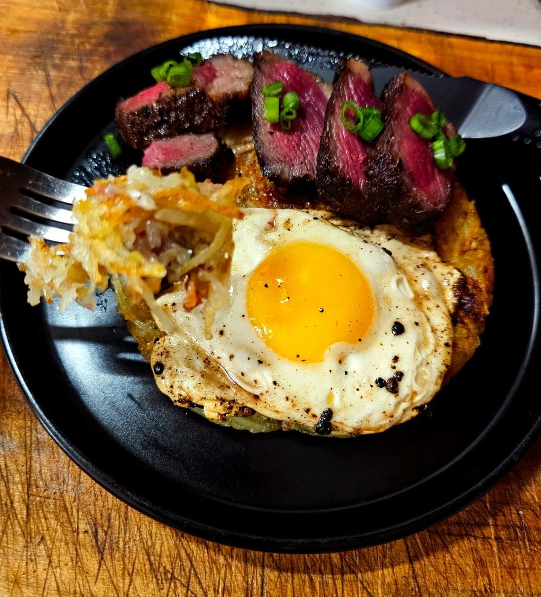 While it rests, fry an egg in the steak fat, then throw it all on the potato pancake and enjoy!