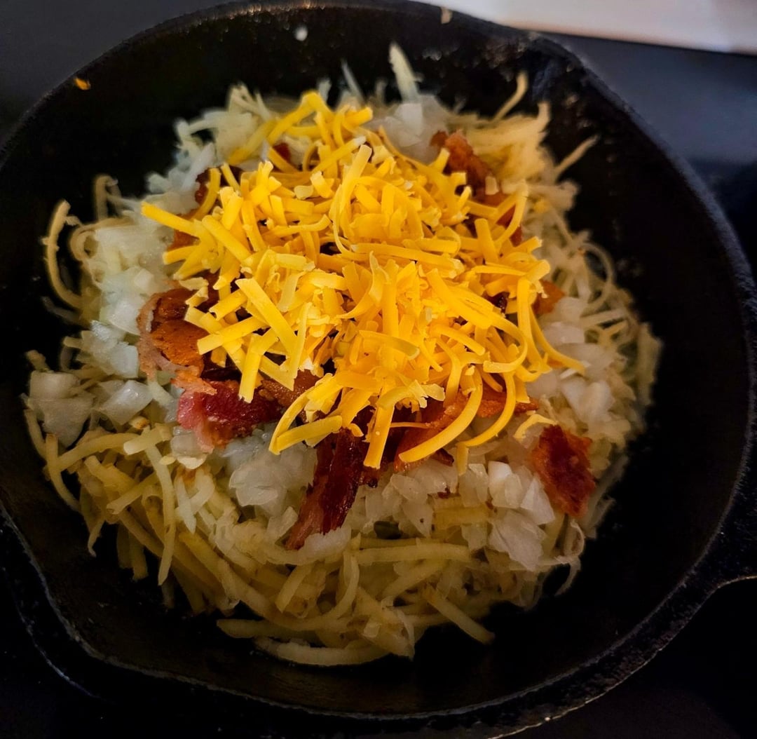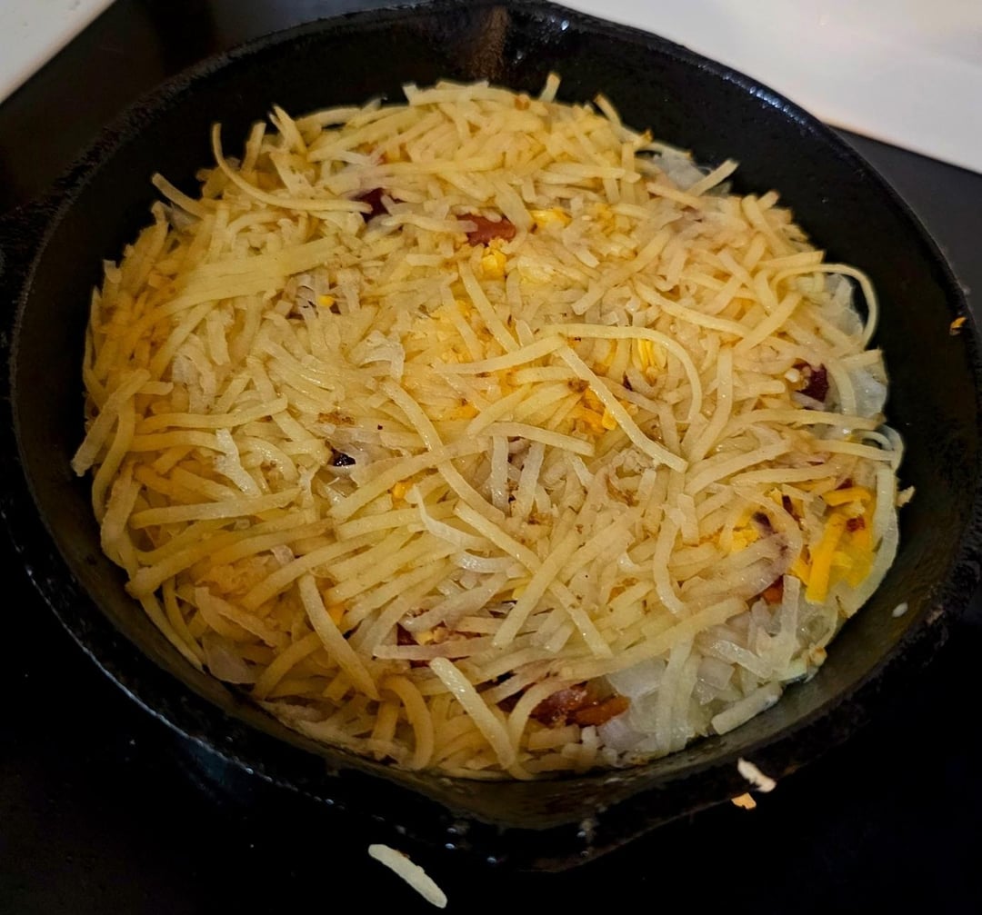 Remove the bacon but leave the grease on medium-low heat, basically as hot as it’ll go without the grease smoking. Start with a bottom layer of potato, onion, bacon, cheddar, and a top layer of potato. Press it down into the pan to flatten it and let it cook. This can take a bit, I didn’t time it but if I had to guess it was probably 20-30 min. As the edges start to crisp tuck them in to help it hold shape when it comes time to flip. You’ll know it’s ready when it starts to loosen up and you can get a spatula under it without it falling apart. Flip it out into a plate then flip it back into the pan upside down, give it another press, and let it cook until that side browns. Make sure it’s not sticking then set the whole pan aside to keep it warm.