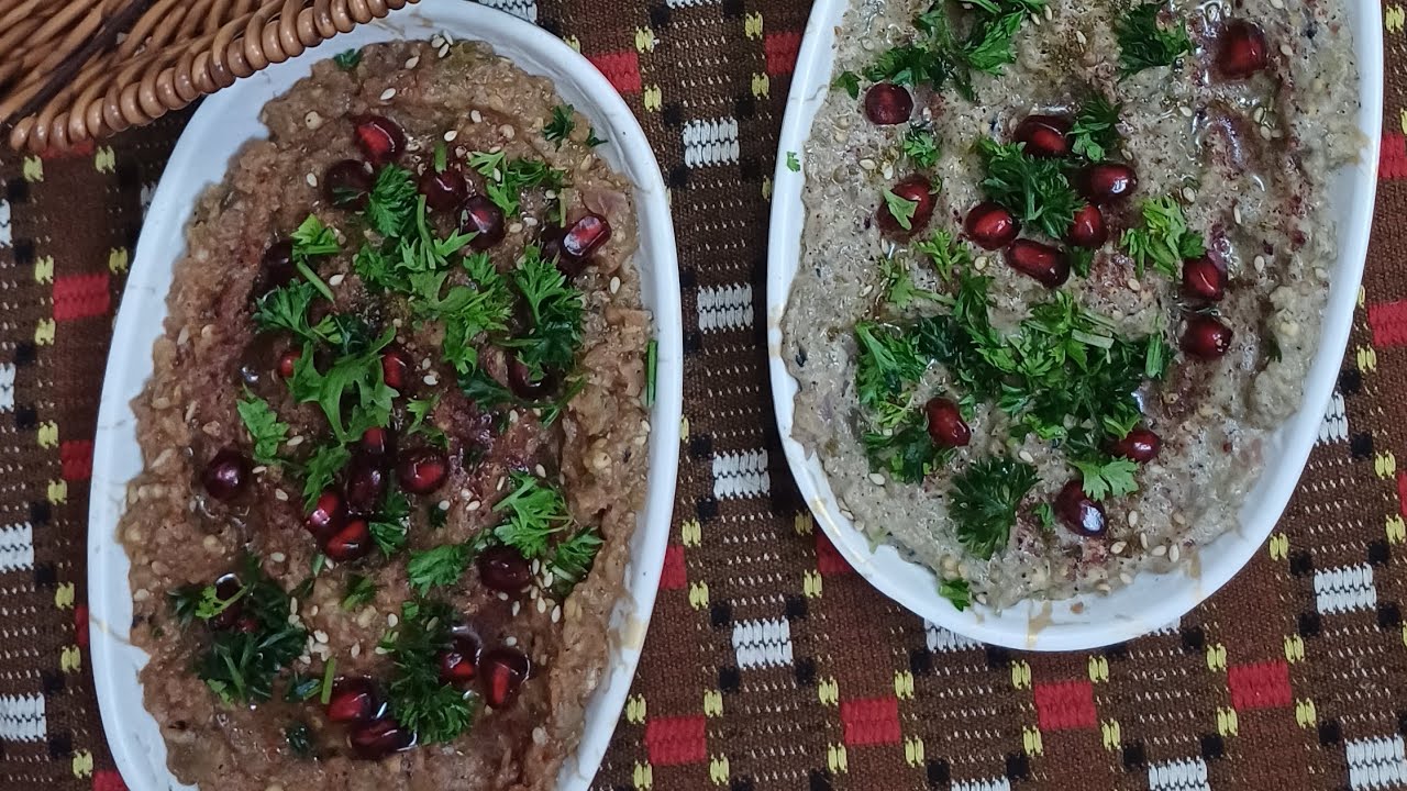 Hi friends, welcome to Vidya’s cooking channel. This is Vidya Lakshmi. Today I’m going to show you how I prepare this Baba Ganosh recipe. This is on my Arabic inspired recipes. I’m using large eggplants, tomato, onion, garlic, bell pepper, and chilies. First, I’ve rinsed the eggplant, chopped it in half. Then I’ve scored it in the middle and applied tiny amount of oil. Half the eggplant I’m going to be roasting it directly on fire and the other half I’ll roast it in the pan because I need slight amount of smoky flavor. I don’t want it to be too smokeoky. Once the eggplant has roasted well, I’ll remove it from the pan and from the fire and reserve it because we need to peel the outer skin. I’ll be gradually roasting all the veggies. If you cannot uh roast the eggplant on the fire directly, please use an oven or roast it as I’m doing it on the pan itself. This is the safest method. Now uh once the eggplant has cooked well and it is soft and the outer skin has charred, I’ll remove it and reserve it in a bowl. Next, I’m going to be uh roasting the onion, bell pepper, tomatoes. I’ll slightly brush some oil on both sides and roast all these veggies as well. We need to roast it till it turns light golden in color. This is also going to cook all the veggies halfway through. Now once the veggies have halfway cooked and my eggplant has cooled down, I’ve started to peel the outer skin that is the charred skin from the eggplant and I’ll reserve only the flesh. I’m using this eggplant in both recipes muktal and the baba ganoush. Now you can see my uh uh tomato onion has roasted well. I’m going to be roasting the garlic and chilies in the same manner. Slightly brush some oil and roasted and reserved. Here my eggplant is ready. We need cumin seeds, chili flakes, chili powder, sesame powder, the roasted veggies. Then I’ll be using sumac, zatar, lime, olive oil, and roasted sesame seeds for this recipe. Now I’m going to be adding the uh roasted capsicum that is the bell pepper to a chopper along with the roasted chilies, onion and garlic. We will slightly be um grinding this in the chopper. Once it is halfway ground, then I will be adding the tomatoes. Now the tomatoes would have cooled down. I’ll just peel the tomato skin and add the tomatoes. We’ll chop this tomatoes roughly. Once the tomato has roughly chopped, I’ll add tiny amount of salt and roughly chop it again. Now to this itself, I’ll be adding some zatar, some sumac powder. And we’ll be adding the chili powder, chili flakes, roasted and uh powdered cumin and sesame powder. We have roughly chopped all the ingredients. Transferred it to a mixing bowl. To the same chopper, I’ll be adding the roasted and uh smashed eggplant. We will chop this roughly chopped this. Again, nothing should be finely chopped. It should all be roughly chopped. Once it is chopped, transfer it to the masala that we created earlier. Now, we’ll be mixing all these ingredients. Check for salt and add salt. I’ll also add some lime juice. Mix it once more. Then, I’m going to be serving this directly on the serving plate. I’ll just spread this on the serving plate. Next, I’m going to be topping the baba ganoush with some olive oil. I’ll sprinkle roasted sesame seeds, zatar, sumac, and pomegranate seeds. I’ve also sprinkled some finely chopped parsley and serve this with some pa bread. I’ve got a detailed recipe on pa bread and kubus on my channel. Do try this recipe, friends. It is a very nice and tasty recipe. It pairs very well with pitha bread and the kubus. Your children and elders at home will really enjoy this. So will you try this recipes and post your comments. Share this recipes with your friends and family. Hope you all enjoy these recipes. I’ll see you soon in the next recipe video. Thank you so much for watching. Bye-bye.
