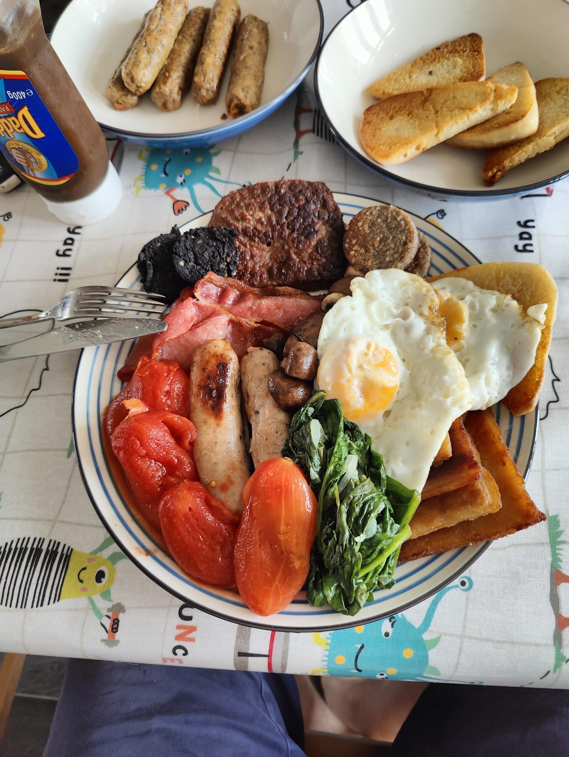 B&W puddings, steak lorne sausage, soda bread, potato bread, thick cut smoked back bacon, sausages, sauteed spinach&onions, mushrooms and tinned tomatoes. by DookieofHazard Dining and Cooking