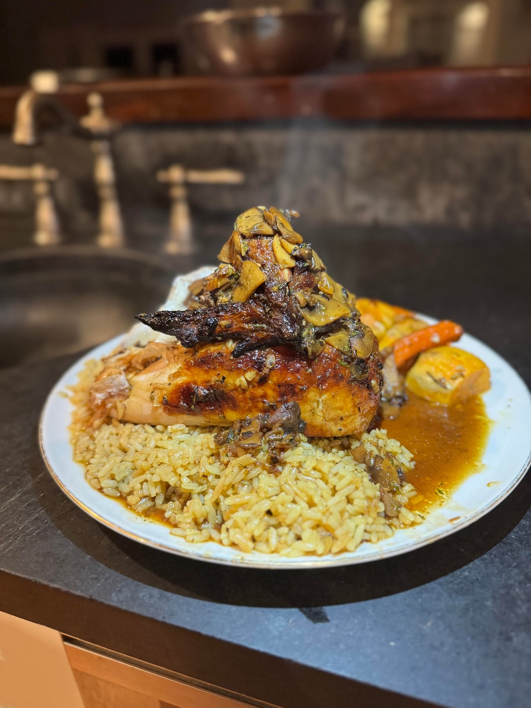 2 day brined spatchcock chicken from a local farm, folded over sweet potatoes and carrots, served with rice pilaf and a mushroom white wine bone broth pan sauce. It was something truly special. I’m very grateful.