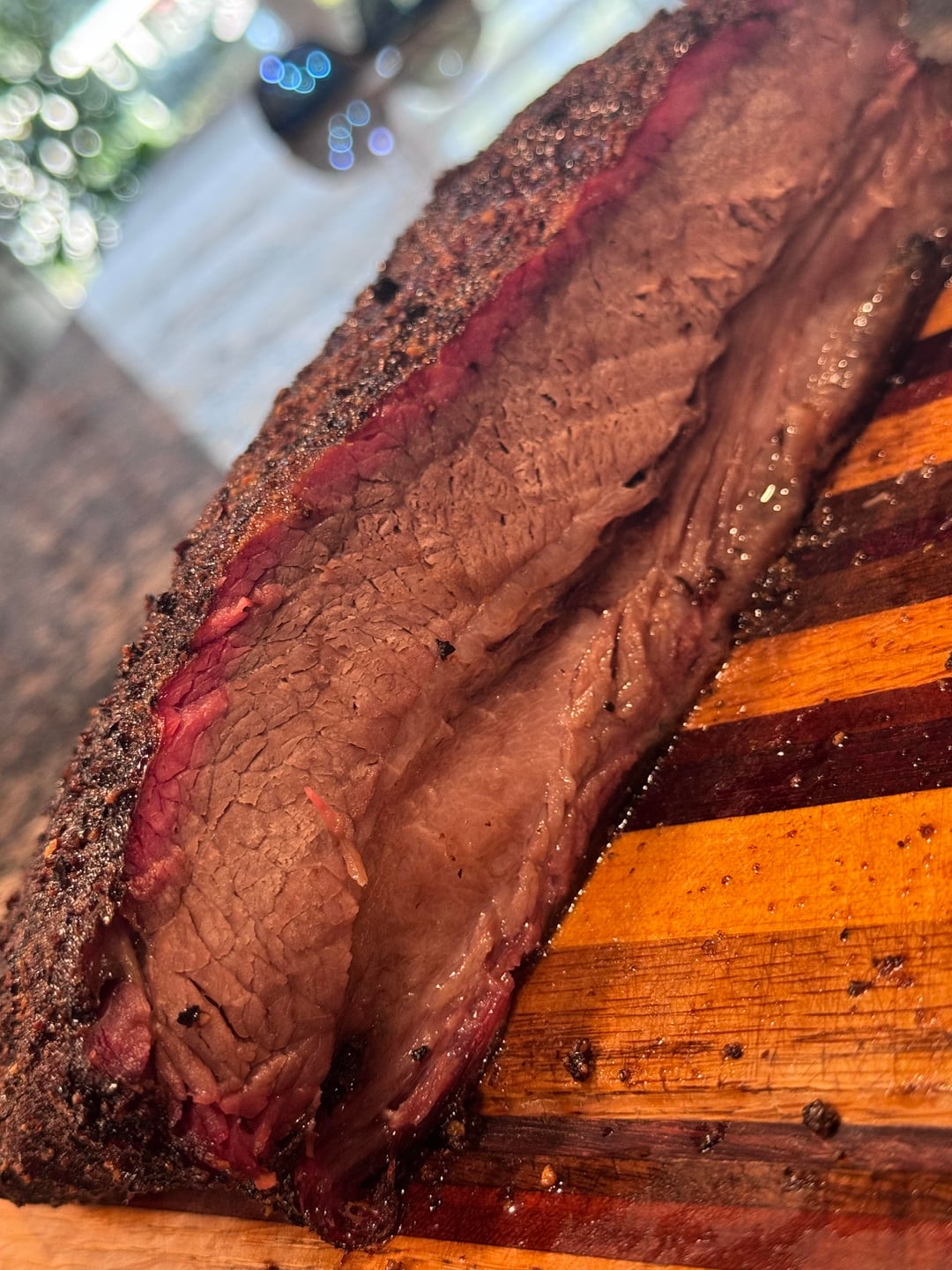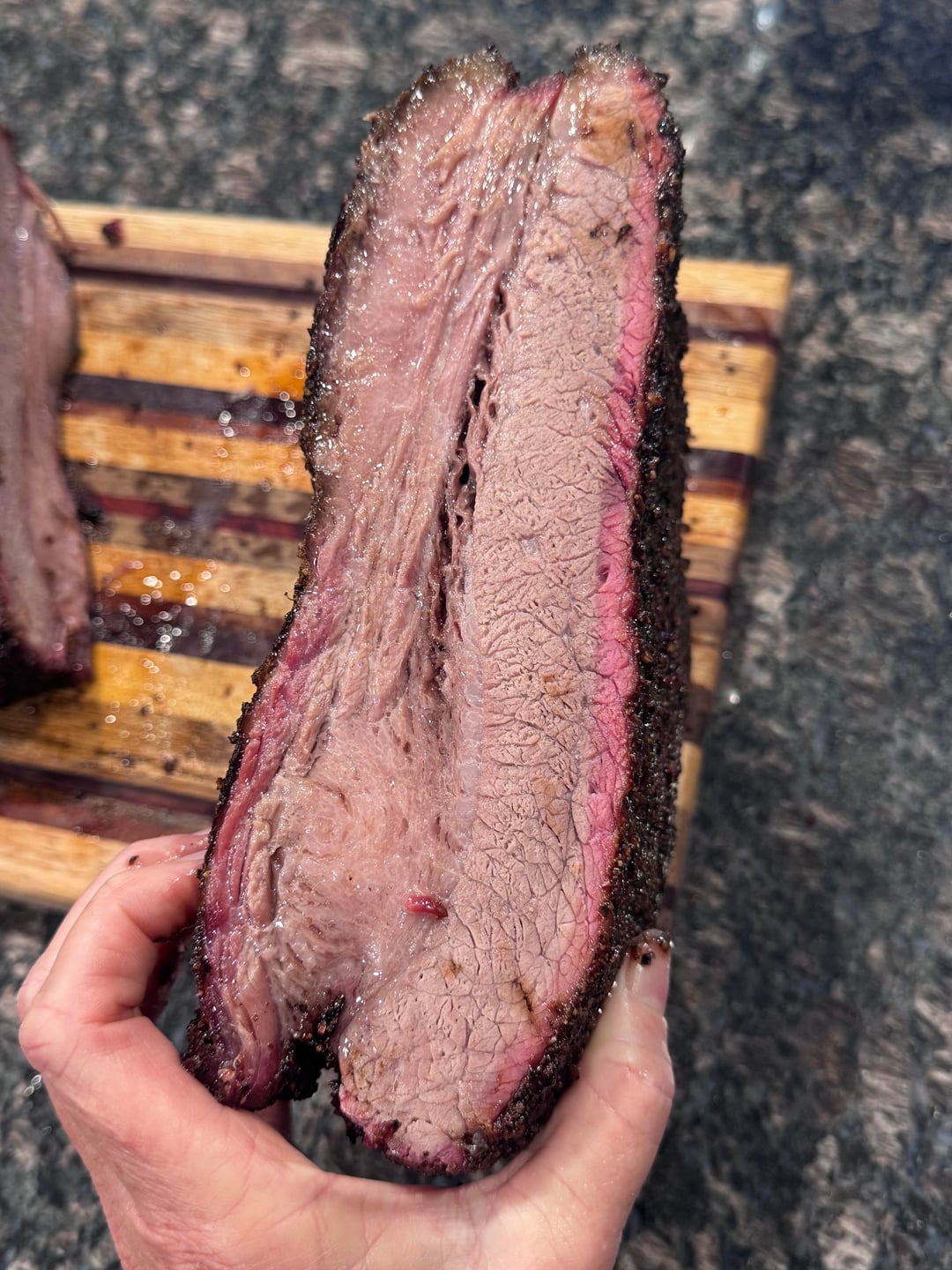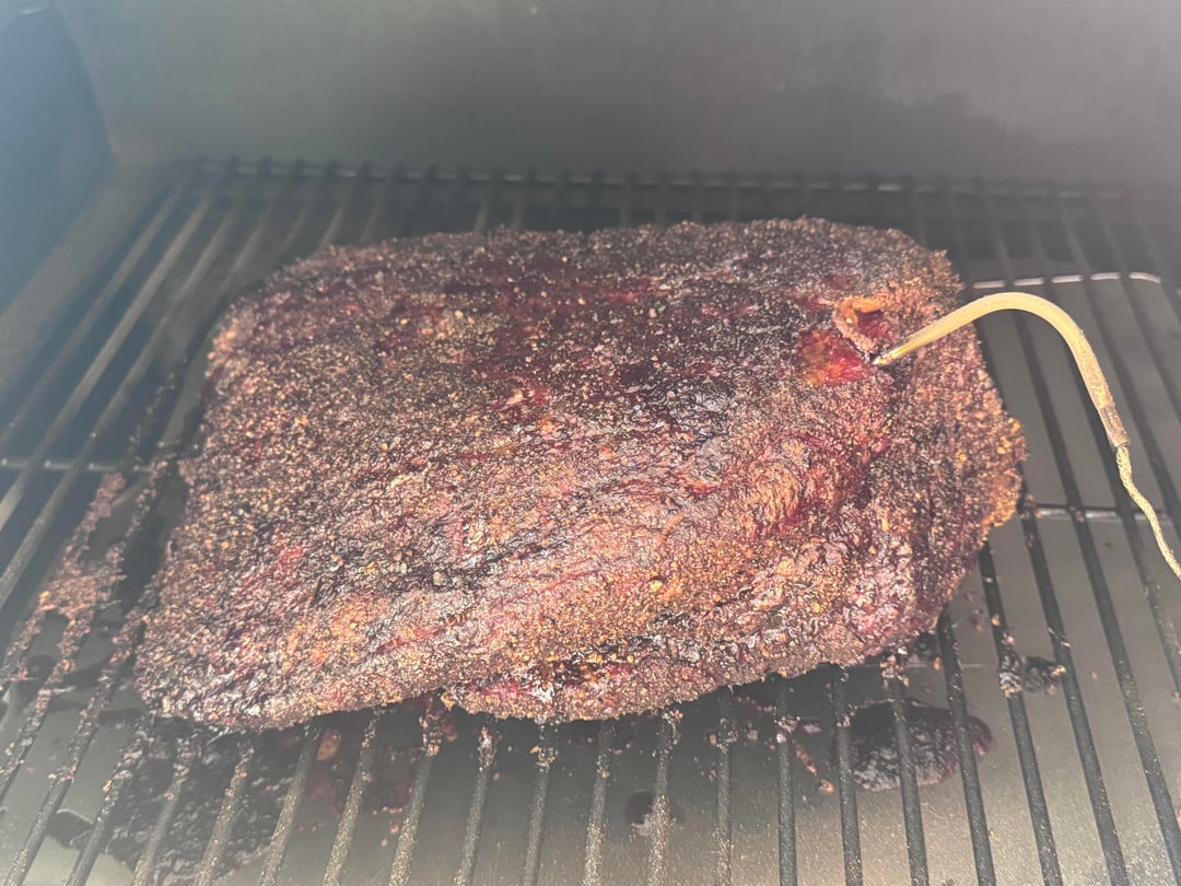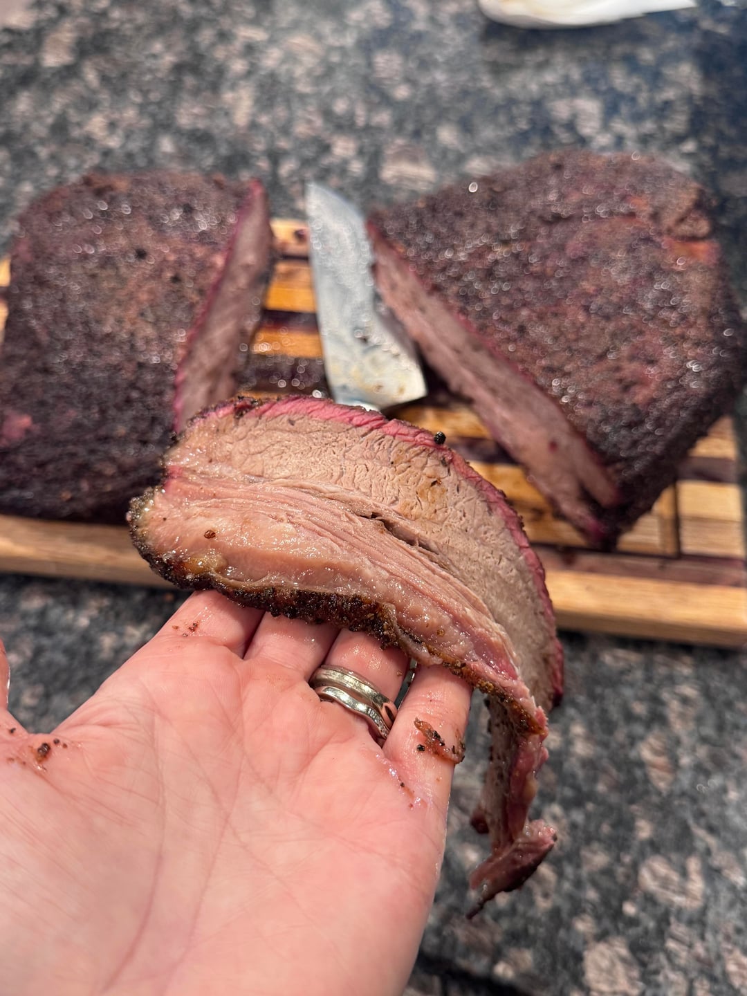My work here is done. Smoked this 11lb brisket unwrapped at 225 until probe hit about 194. Then I wrapped in butcher paper, placed it in cooler, insulated with old sheets and a paint drop cloth for about 5 hours. It is bursting with flavor. The bark is epic🤤 -Heading back to the kitchen where I belong👩🏼‍🍳