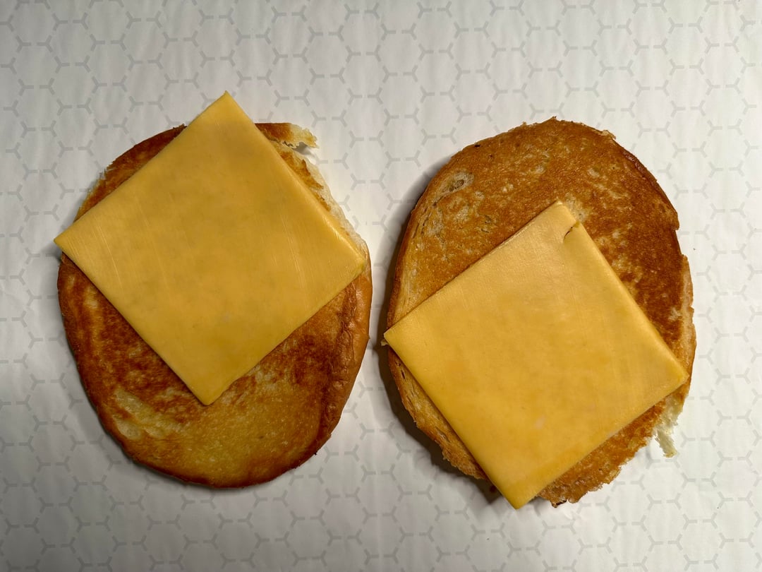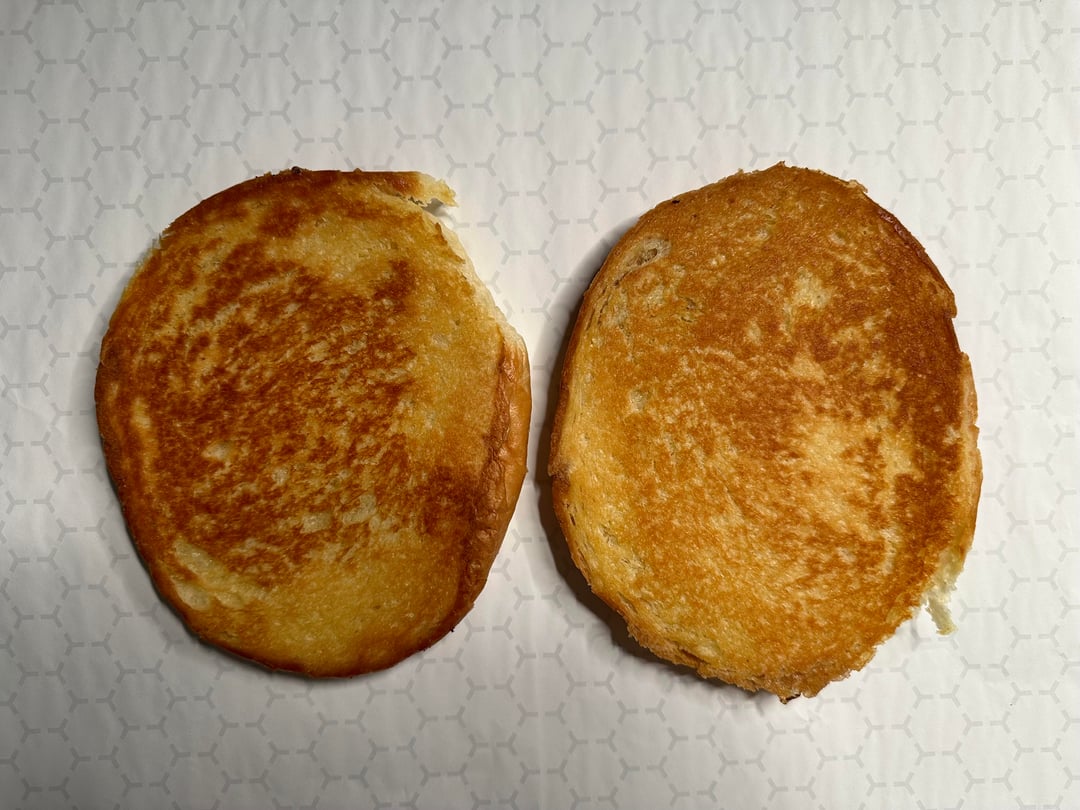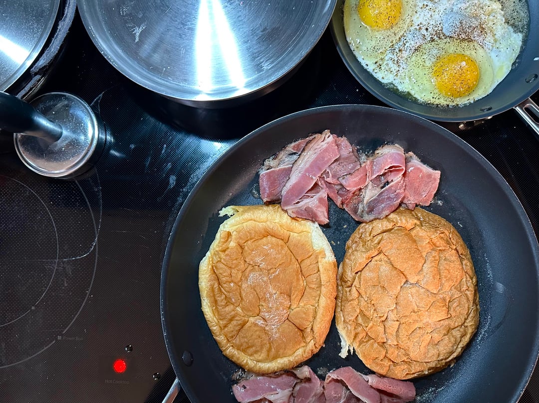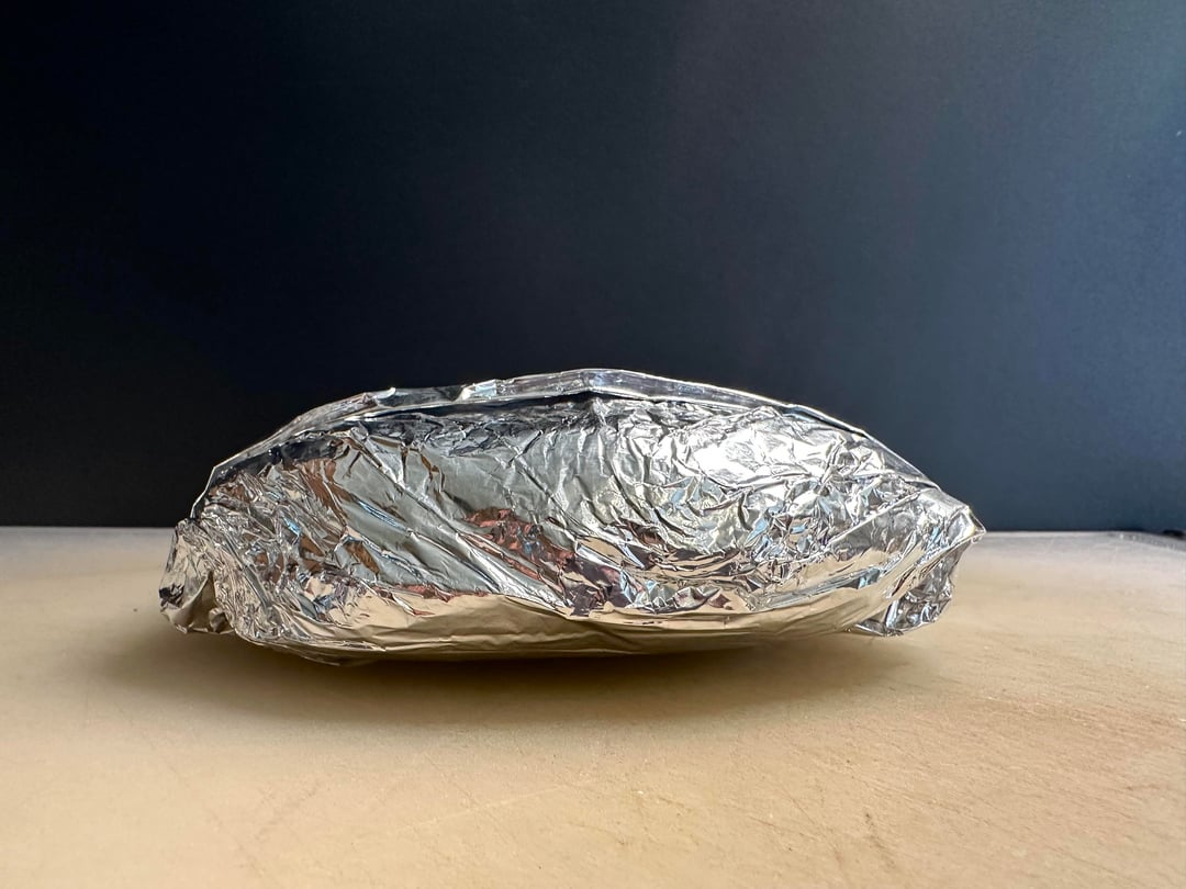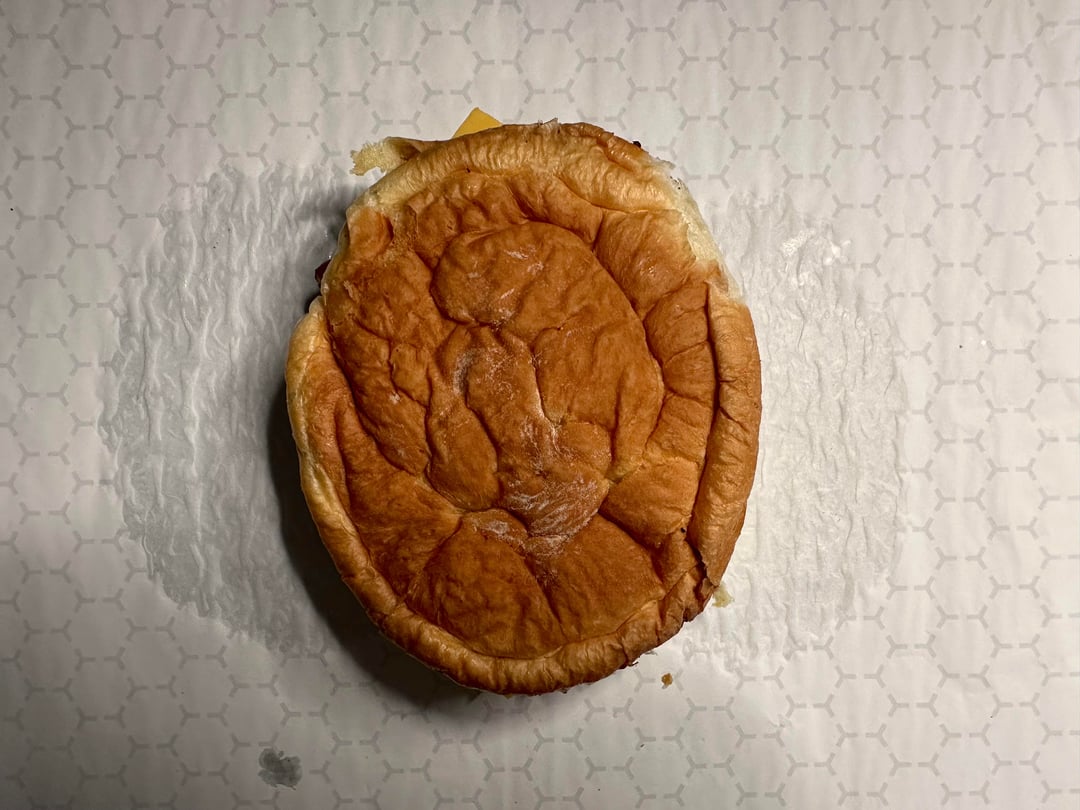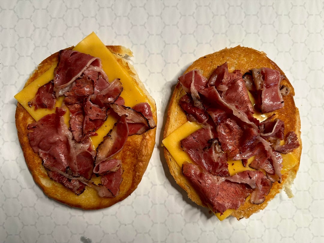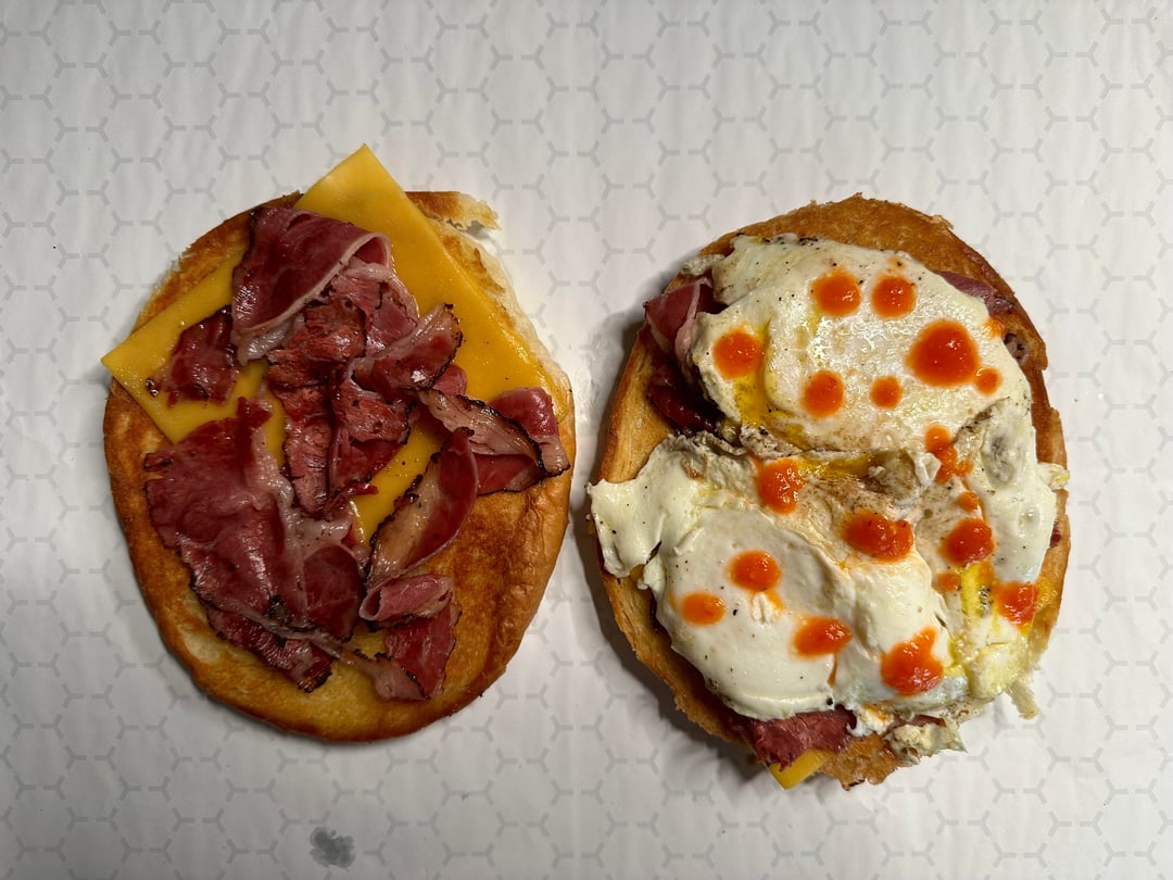 Two over medium eggs, pan-fried pastrami, American cheese, and Marie Sharp’s hot sauce, on a buttered and griddled Kaiser roll. Then wrapped for maximum enjoyment