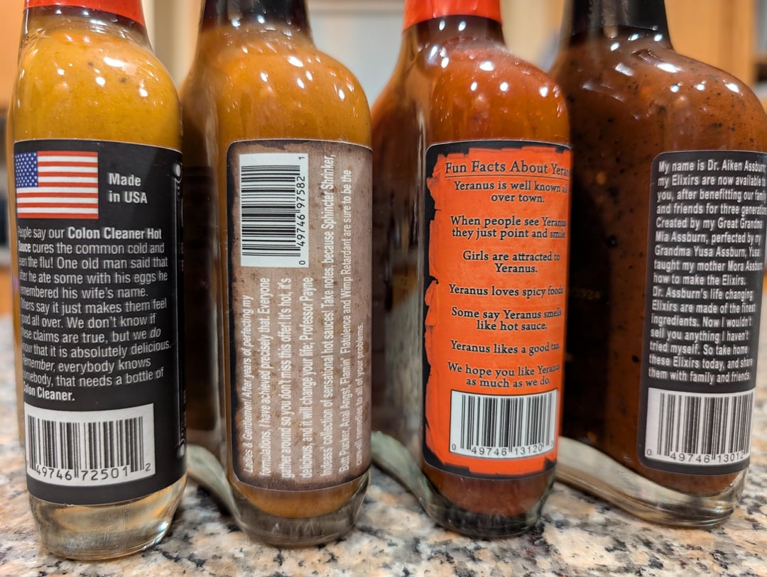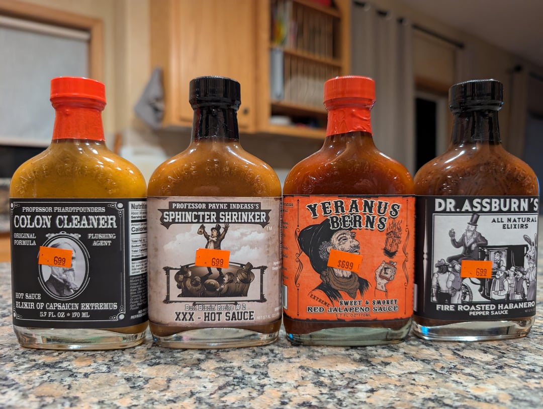 This dethroned El Yucateco for me.by riyiyi 10 Comments guysitsausername 4 months ago Sphincter Shrinker is cracking me up. flatulence55 4 months ago Colon cleaner has been a staple for me for over a decade. I add it to coleslaw for a flavor boost. riyiyi 4 months ago Dr Assburn has been my favorite. Backyardsmoker92 4 months ago Colon cleaner is a good sauce. STFUNeckbeard 4 months ago Yes everyone, butthole and poop related names. You don’t need to tell everyone how you hate them and would never try them.With that out of the way – Sphincter Shrinker is definitely great. I think the only extract sauce I actually like GravyPainter 4 months ago My one rule is no buttstuff Wonderful_Bug3111 4 months ago Colon Cleaner is delicious! JackieTobacky 4 months ago The Scorpion sauce from this brand is nuts for eastern Asian food. Like a very spicy teriyaki BenjaminGeiger 4 months ago Professor Phardtpounder’s made me giggle so I bought a bottle. Then I tried it and now it’s one of my favorite sauces. Tokyosexwhale 4 months ago “Girls are attracted to Yeranus”Better eat some…