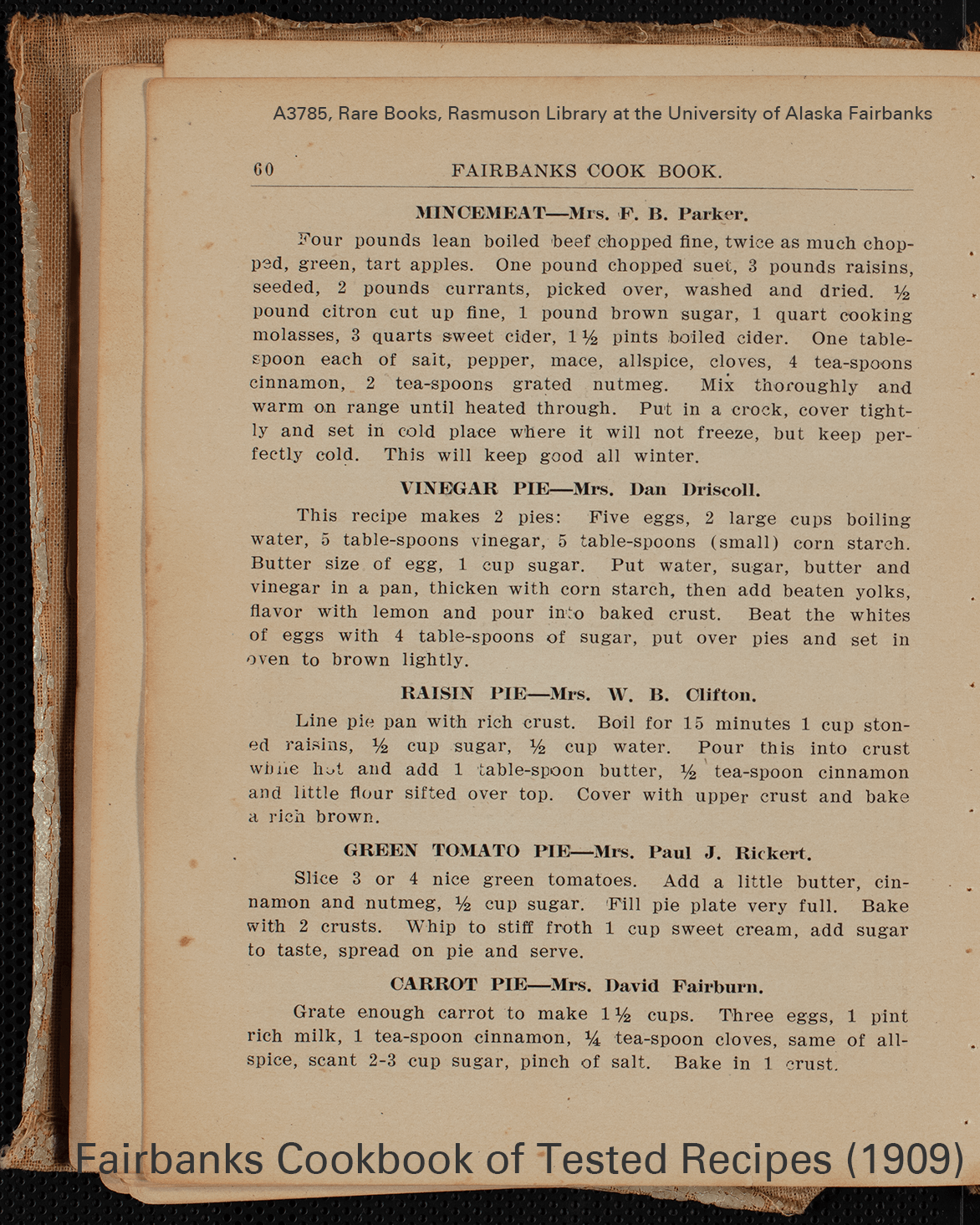 Back again with our old Alaskan recipe books this time including some really interesting savory and vegetable-based pies! A colleague says that most of these are "actually not bad," although the green tomato pie is "okay." Personally, the carrot pie is on my to-try list. For the rest of the cookbook, please see it (and others) online here at UAF's Digital Repository. A few pages up is a rutabaga pie, as well. Let us know if you have any questions!
