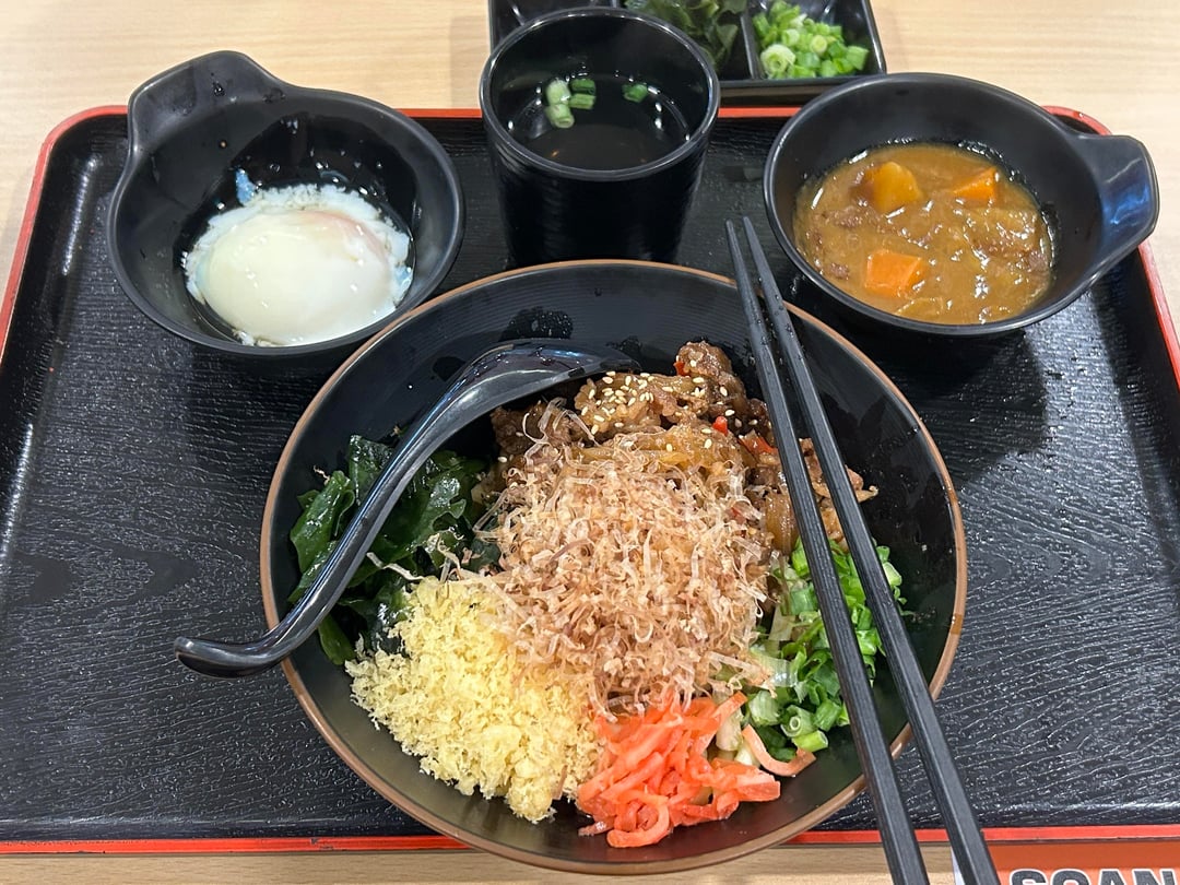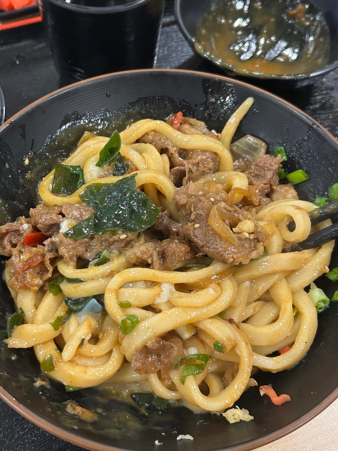 about one serving of udon was underneath all the toppings, and there was only a few carrot and potato chunks in the curry, which looked like about 2/3 cups worth. the yellow flakes are fried tempura bits. by StrangeAir6637 Dining and Cooking