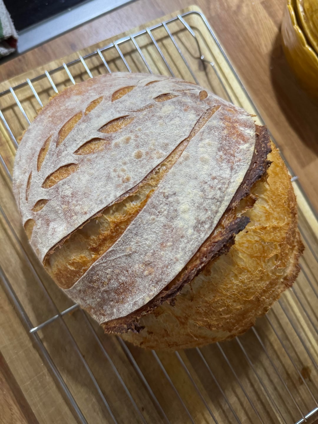 I think bulk fermentation was about 6.5 hours, then shaped and put in fridge. Baked next day in morning, 230C covered for 25mins then uncovered for 20mins.