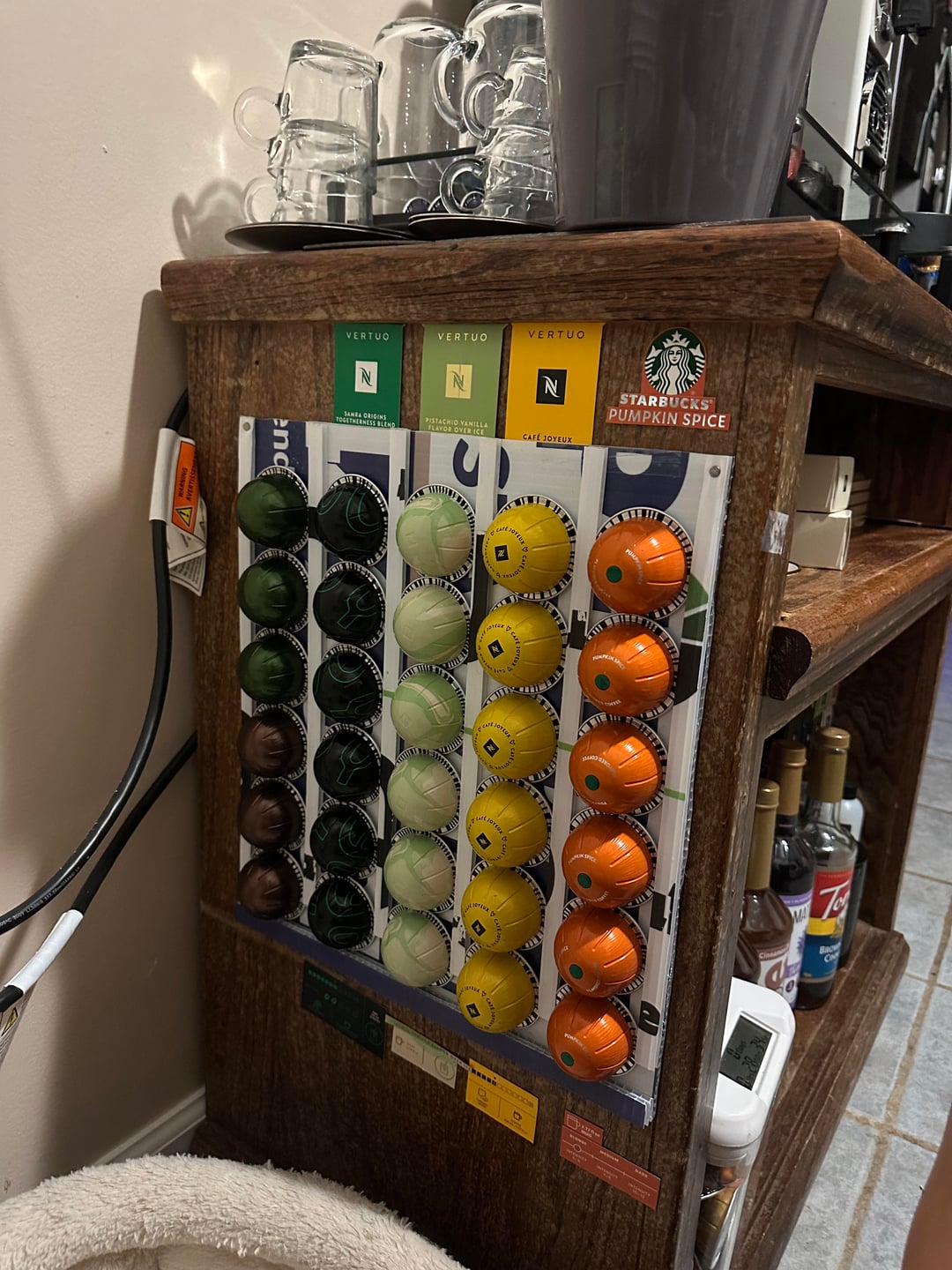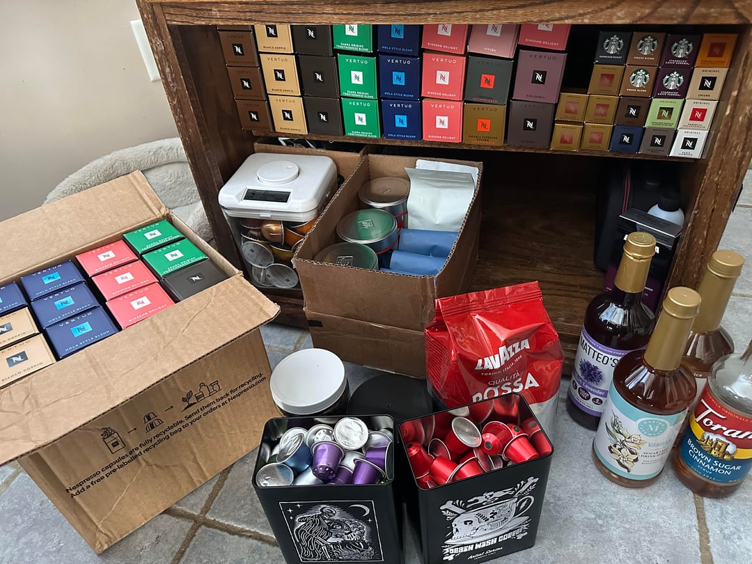 Made a Nespresso dispenser using recycled corrugated plastic cardboard from a yard sign for my Coffee Bar. You fill it from the top and take a pod from the bottom where the pods automatically slide down. I have so many pods and I didn’t want to buy more pod holders. Rising coffee prices and tariffs had me panic buying, I guess.