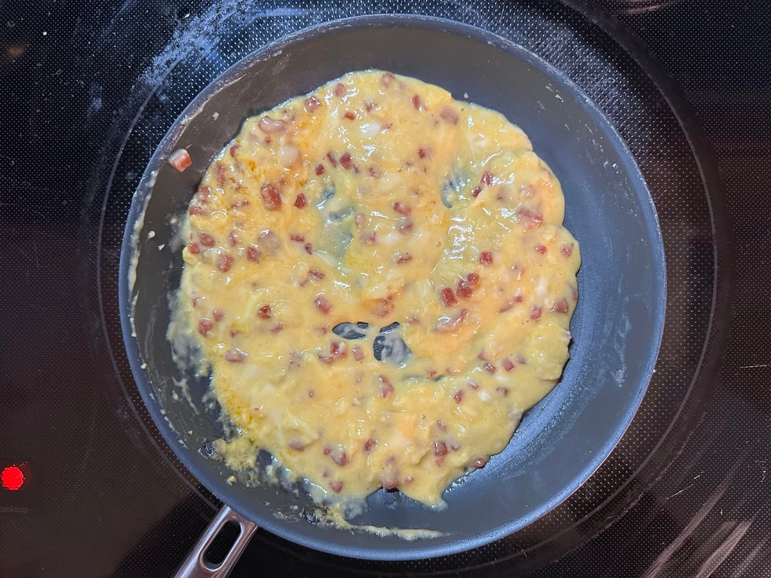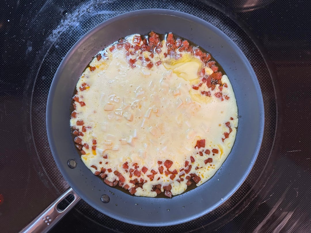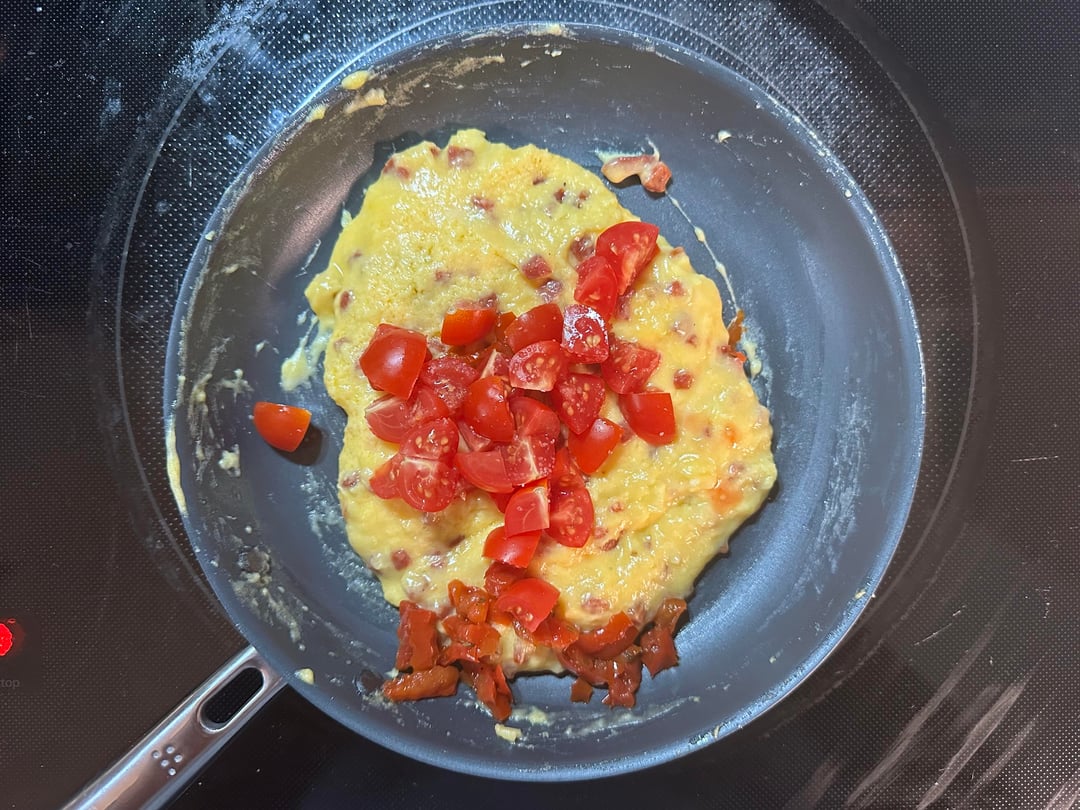 One soft scrambled egg with diced pepperoni, Gouda, marinated red pepper, and diced tomatoes. Topped with crispy scallions, and chives. Served with buttered toast made with homemade rustic white bread. by No_Pattern3088 Dining and Cooking
