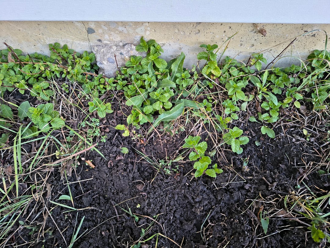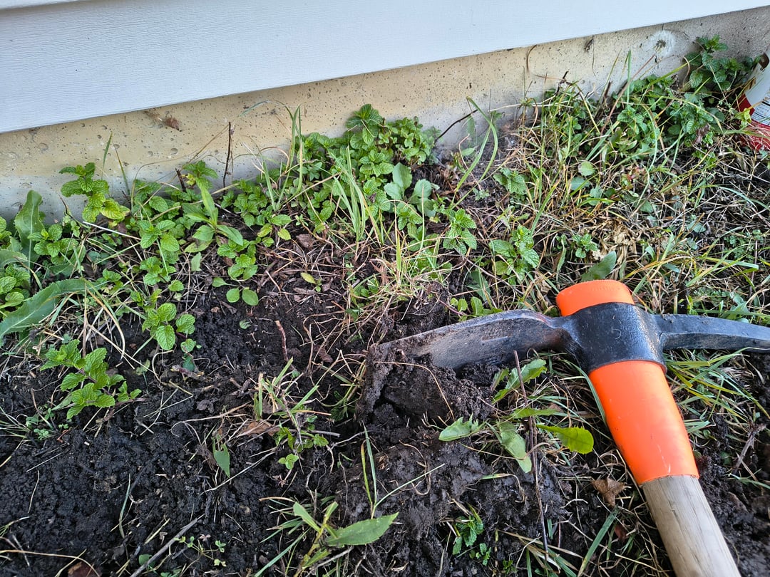 I am at my parents house and want to plant garlic in this strip next to the front side of the house. It was weedy and so I started clearing it with the mattock and discovered most of the weeds were mint. Sorry for the low light picture, it is already night time and I want to plant tomorrow.