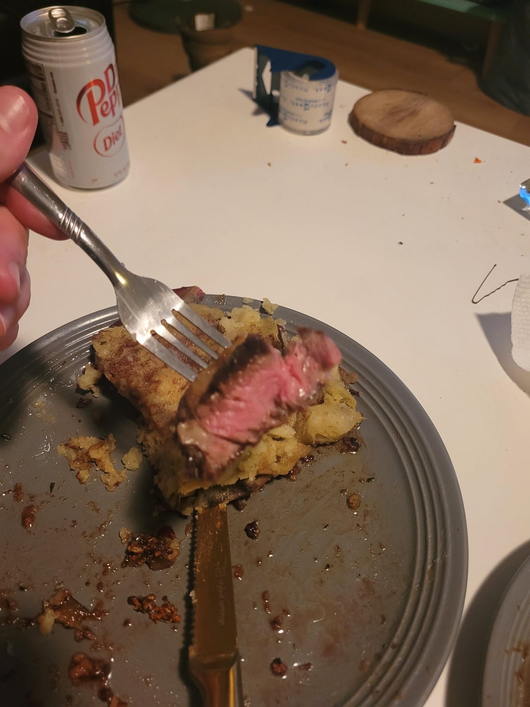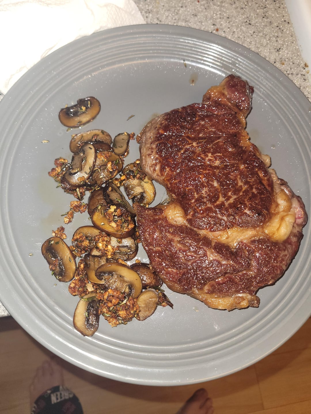 Reverse seared boneless ribeye topped with garlic mushrooms (yes I know the garlic is a tad overdone.) Served with mashed sweet potato and Prosciutto wrapped Asparagus. Onto the next chapter.