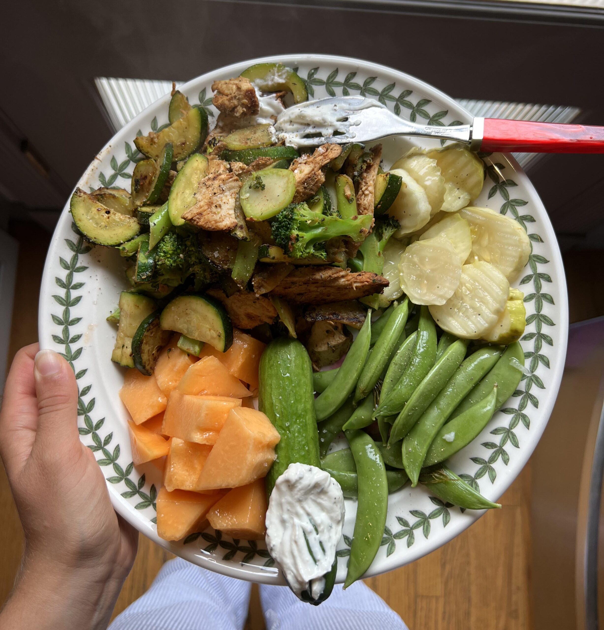 hope this is good enough for this sub !! zucchini n broc with some chilli lime chicken (trader joes), pickles, sugar snaps, cuke, melon (goat volume food imo), and ranch cottage cheese dip (also TJs)