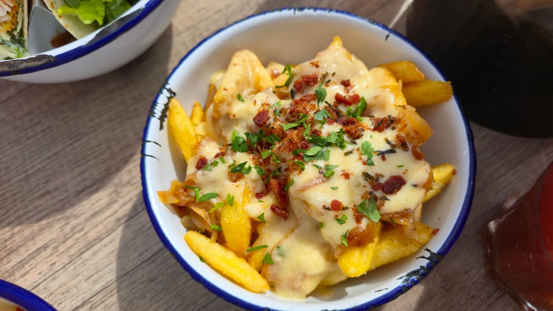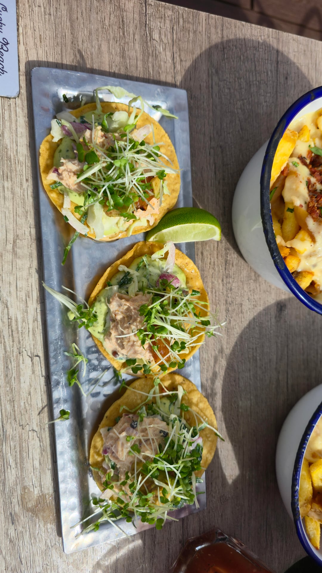 Crab tostadas. Crayfish tacos and alpine frites. Lucky beach cafe Brighton beach