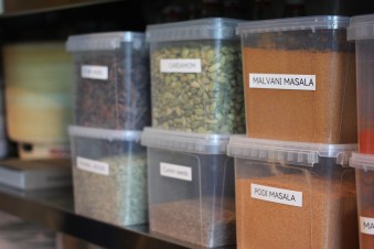 Design intentionally spills into kitchen. Rows upon rows of neatly contained and labelled ingredients — spices, dried fruits, salts and herbs – line the area behind Kavita’s bar seating. The pantry blends BC and many regions of India, with rice, herbs, spices, seeds, salts and dried fruits shipped directly from small farms that Tondvalkar has worked with for years; while wild foraged ingredients such as nettles, mushrooms and herbs come from nearby forests. Every object in the room carries a sense of purpose, including the stones and lichen gathered and displayed by Chef Tushar.
