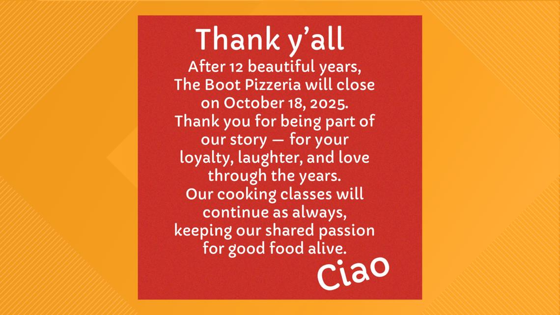 HUNTSVILLE, Ala. — The Boot Pizzeria, serving Italian food in South Huntsville for 12 years, is closing. The restaurant announced on Facebook that October 18 will be its last day.
