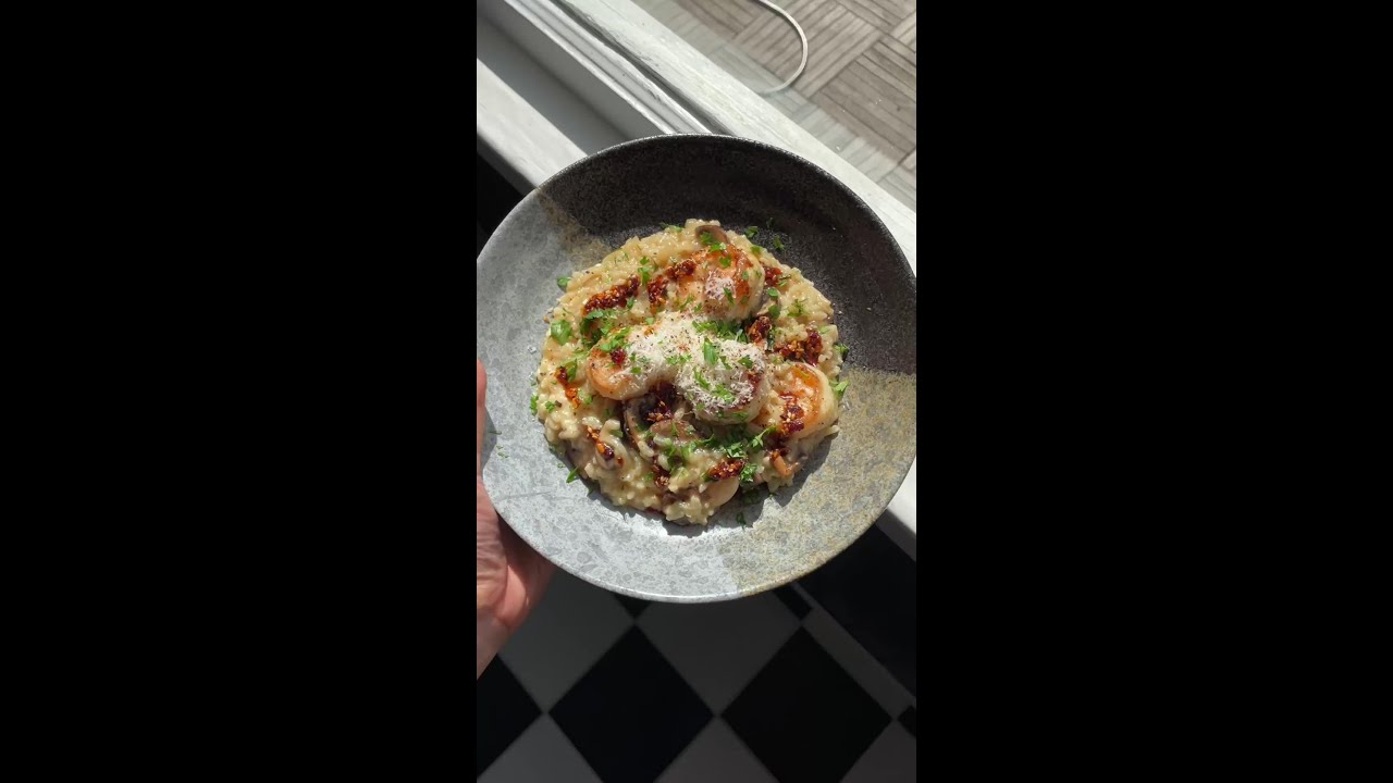 There’s no better way to kick off fall than making my creamy, dreamy, tried and true mushroom risoto. To make this, you just need one pan. And I like to pan sear my mushrooms ahead of time to get that golden crust alongside my shrimp. And then once everything’s cooked, I’m going to let it sit on the side while we start making the risoto. Into a pan goes onions, garlic, sage, and once they’re soft, you can add in the arbor rice or any rice you’d like to use. Let that toast for about a minute. Then we’re going to add in some fennel seeds and red pepper flakes. Now it’s the fun part. So, first you want to pour in about a cup of beef broth or any sort of broth you’d like. Mix and just let the rice simmer until it soaks up about 75% of that broth. Repeat the process of broth mix, broth mix until the rice is fully cooked and you have the consistency that you like. Add the mushrooms in and add as much cheese as your heart desires. Finish it off with your juicy shrimp and chili crisp and enjoy.