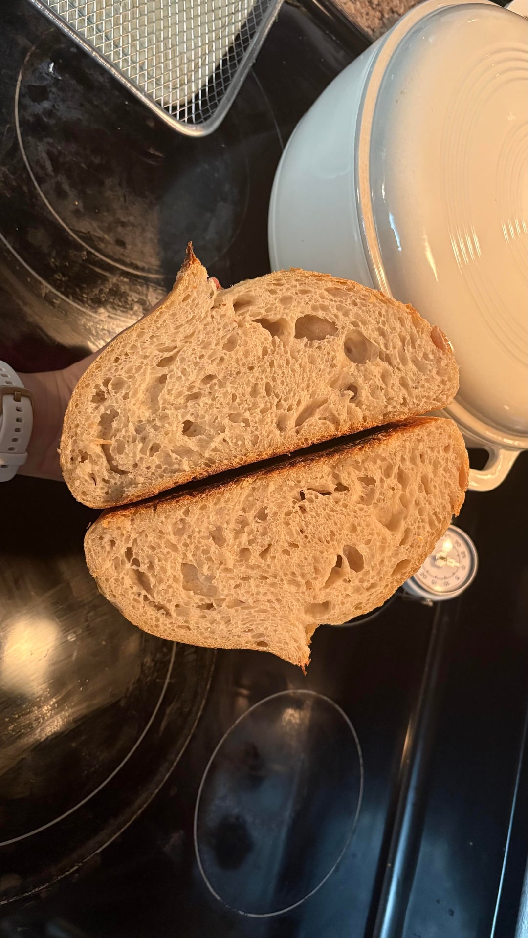 I got this starter from a friend who has a micro bakery. I tried to start my own but it didn’t work out lol. I feed it King Arthur bread flour daily. i keep 25g of starter and feed 25g of flour with 25g of water. But before I started the dough, I fed it 50 and 50 of flour and water. I did 100g of starter, 475g King Arthur bread flour, 10g of Eden’s salt, and 325g water from my fridge. This recipe was from Farmhouse on Boone. Then I used Alexandras kitchen recipe to finish the dough because I couldn’t originally find the other. I also called my mom who told me what she does for her GF sourdough and I just finished how she does it so it’s not exactly like Alexandra’s Kitchen recipe. I let it rest for 30 min. Then folded it on all “sides” every 30 minutes for 2 hours. After that I let it rest covered on the counter for 12ish hours and it did rise. I folded once more then I put it in the fridge for about 48 hours until I had a chance to get to it. Baked at 425°F for 45 minutes covered and then 10 minutes uncovered.