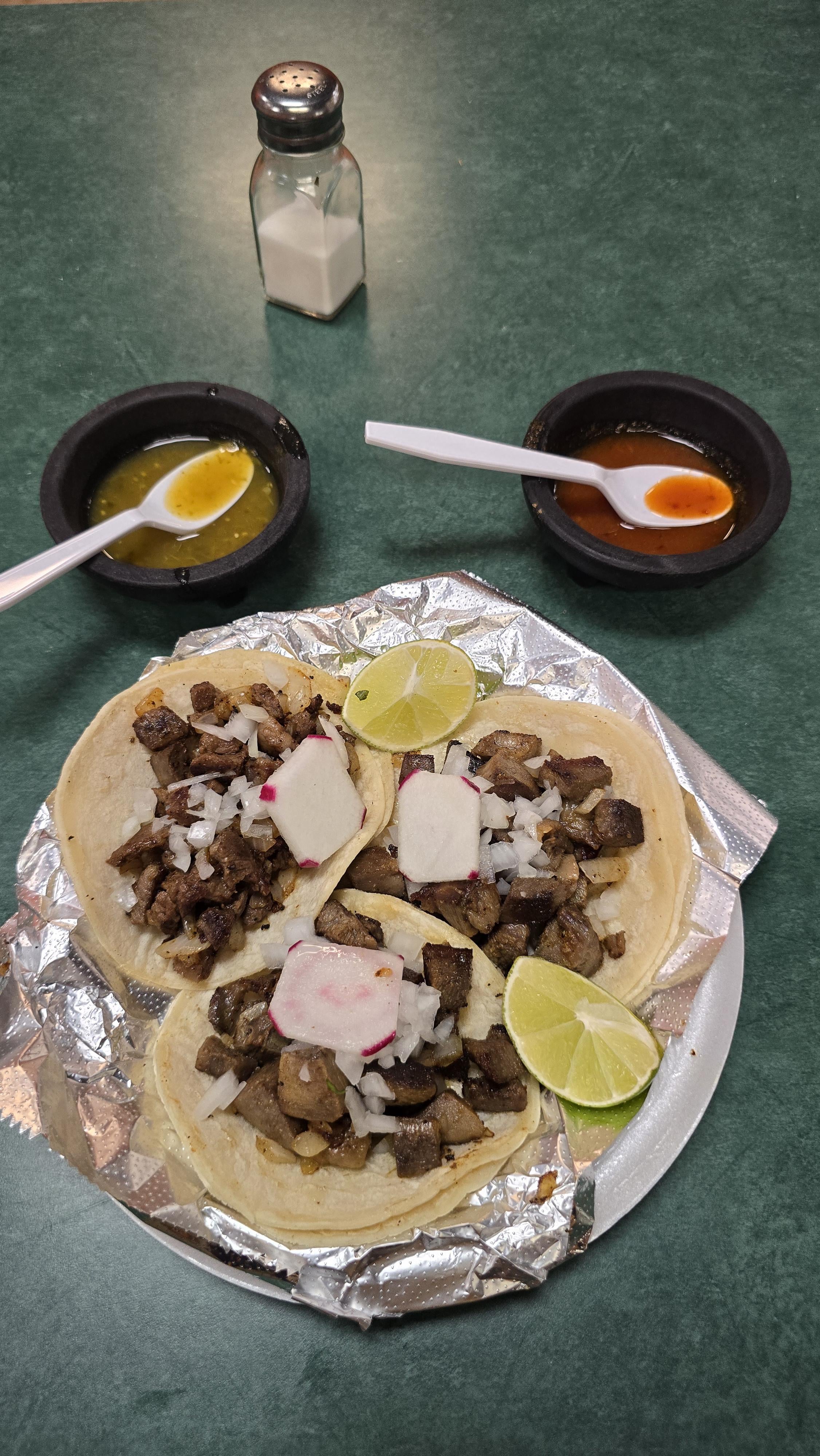 Under $7 at Tortilleria Morelos in Dardanelle, AR. It's a small tortilla shop/grocery store with a tacqueria in the back. Two lengua tacos and one asada. I have been cursed by the cilantro gene, so always have to order mine without. Best lengua tacos I've ever eaten.