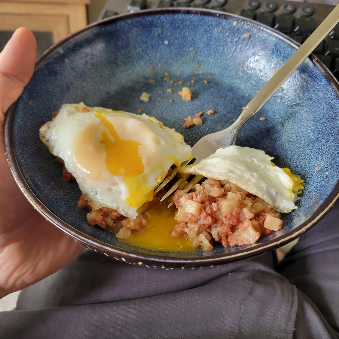 joe_sausage 2 days ago Ugh. The canned corned beef is so gross and so, so, so good. Nicely done with the eggs.