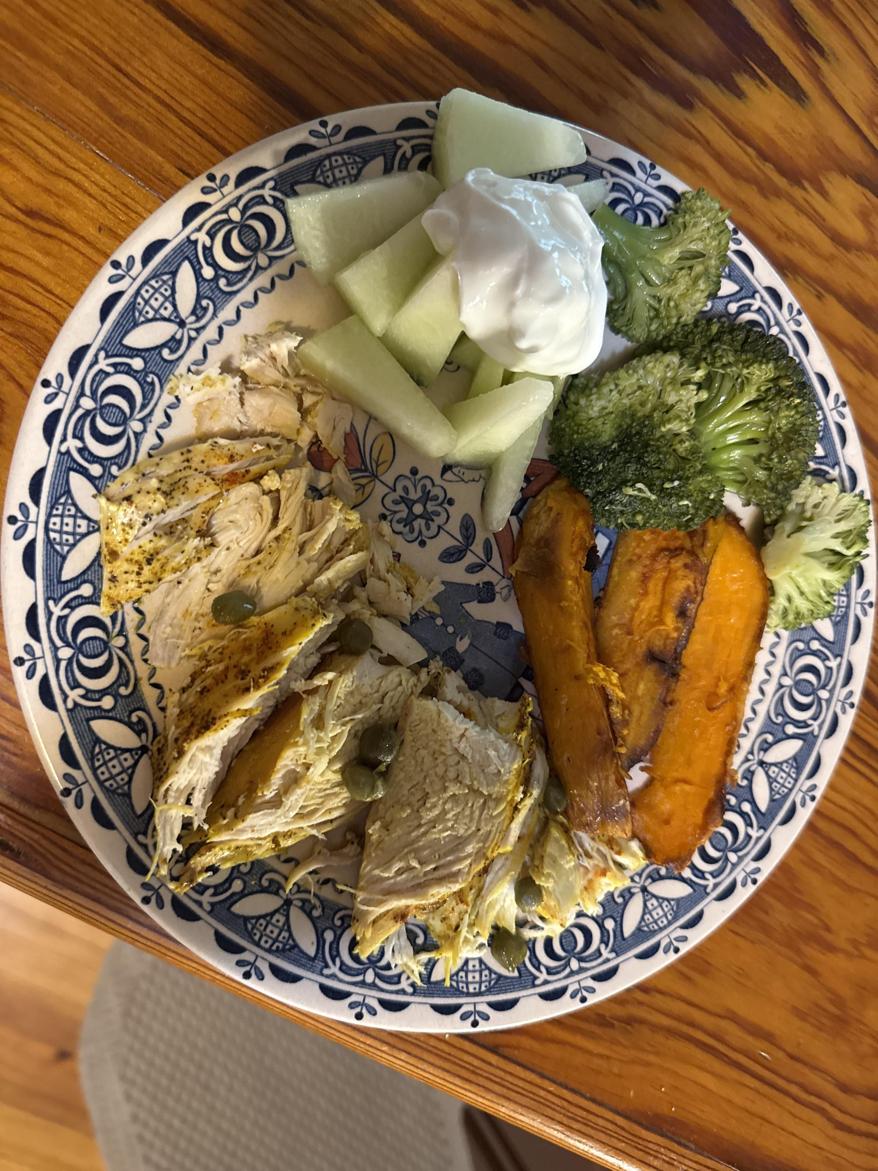 Chicken breast in olive oil/turmeric/paprika/capers, steamed broccoli with lemon juice, baked sweet potatoes browned in olive oil, honeydew with yogurt—