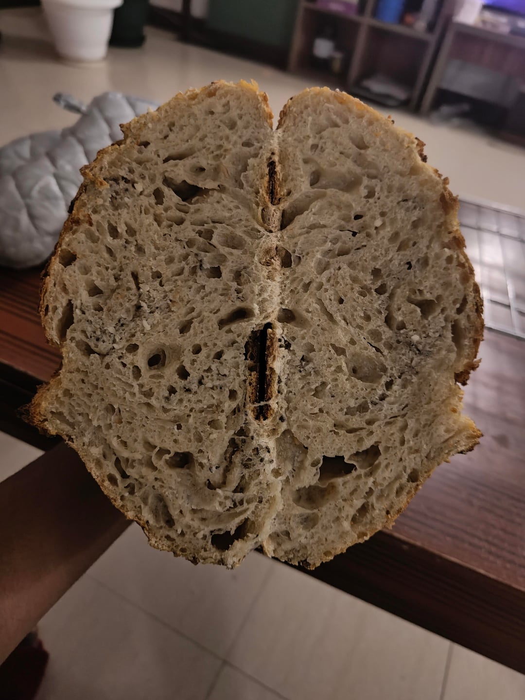 So I've been trying to play around with fermentation recently. After mixing all the ingredients and letting them rest for 30m, I did 2 sets of stretch and folds then 3 sets of coil folds. All roughly 30m apart. I bulked for a total of 5 hours before shaping and putting it in the banneton. I messed up the shaping a bit so I took it out of the banneton and reshaped (probably degassed a bit and introduced seeds into crumb). Then I let it rest in the banneton at room temperature for another 2 hours until it passed the poke test. Left it in the fridge for 16 hours before open baking on a baking steel with steam added by pouring hot water on a baking tray just below.