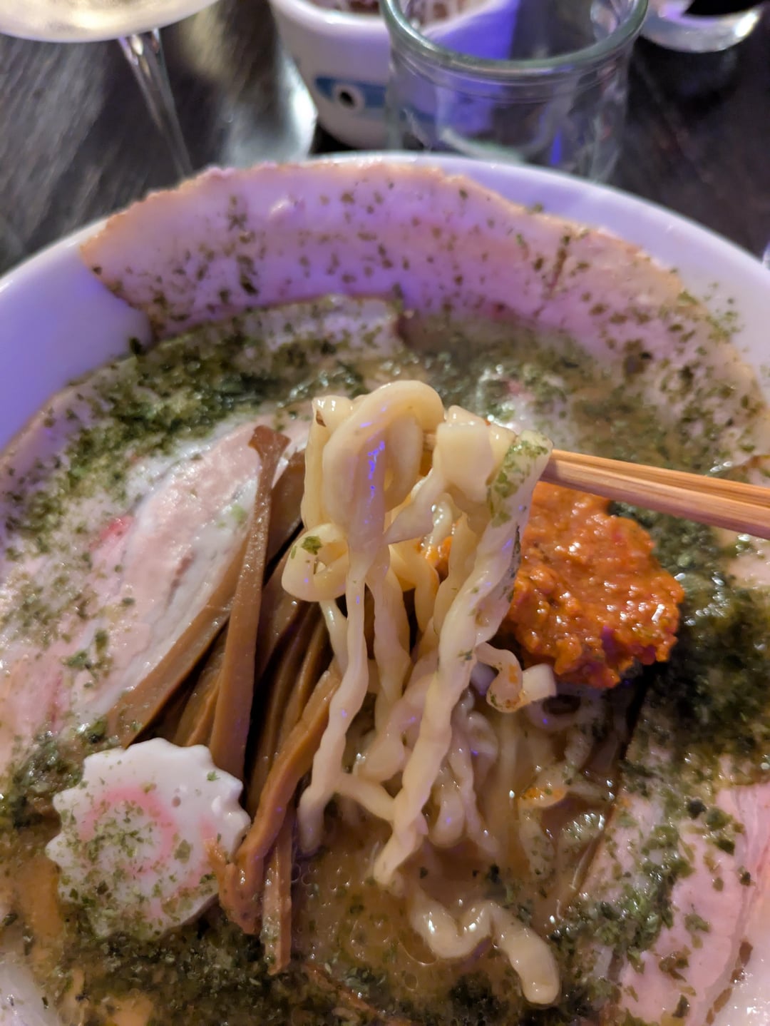 Still cannot compare to the bowl I had at Yokohama ramen museum, but I liked it nonetheless. All the components were nice, next time I'll add more spice ball, it was good but didn't have enough impact for my taste (I'm a glutton for spice/heat), while it was spicy enough for most of the guests. I while ago I found some small anchovies and make niboshi, they turned out well. Used some in this bowl, they added a nice fish/sea scent to the broth. Menma was great too, although painstaking to rehydrate. I cutted chashu with a deli slicer, what a game changer!