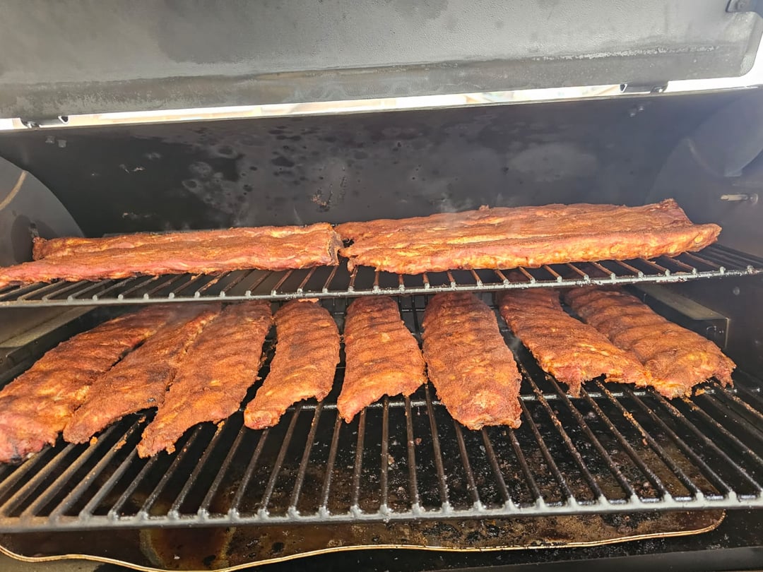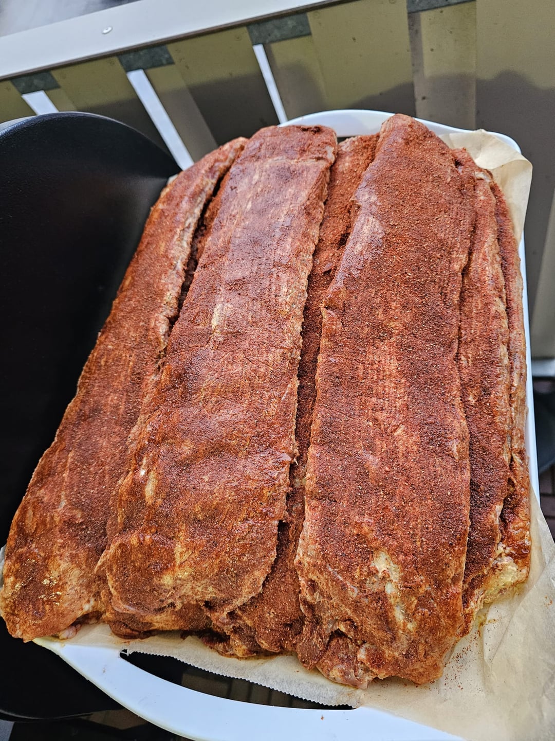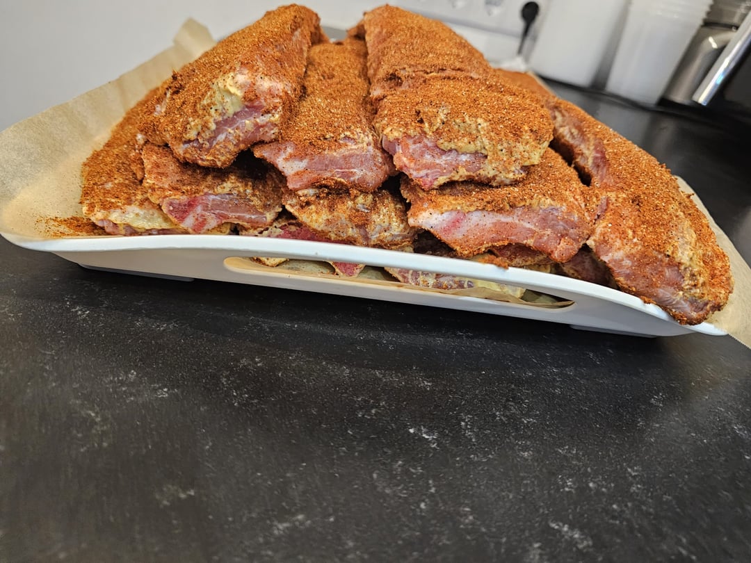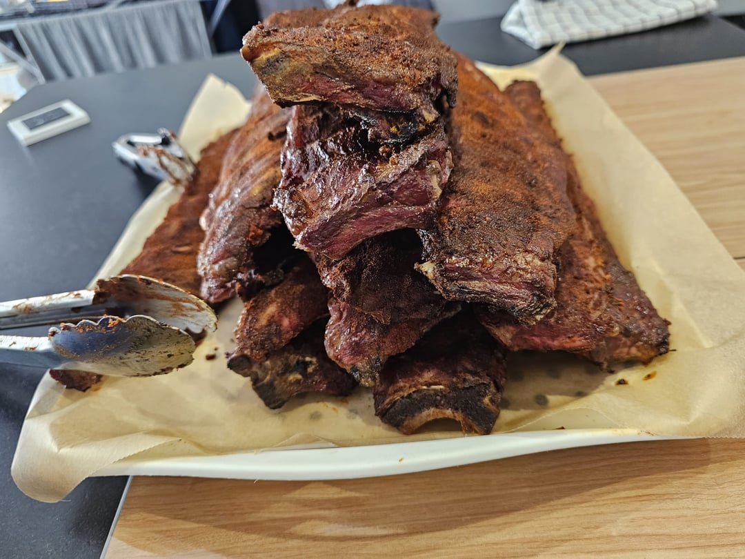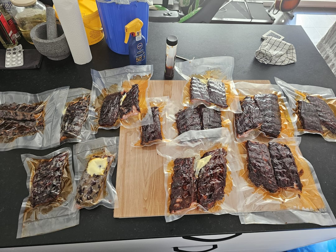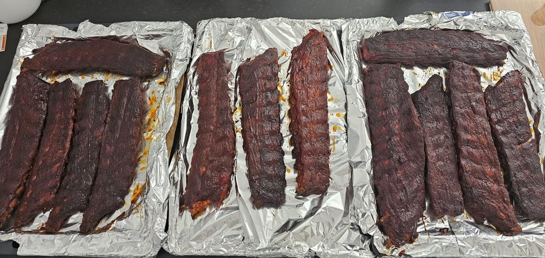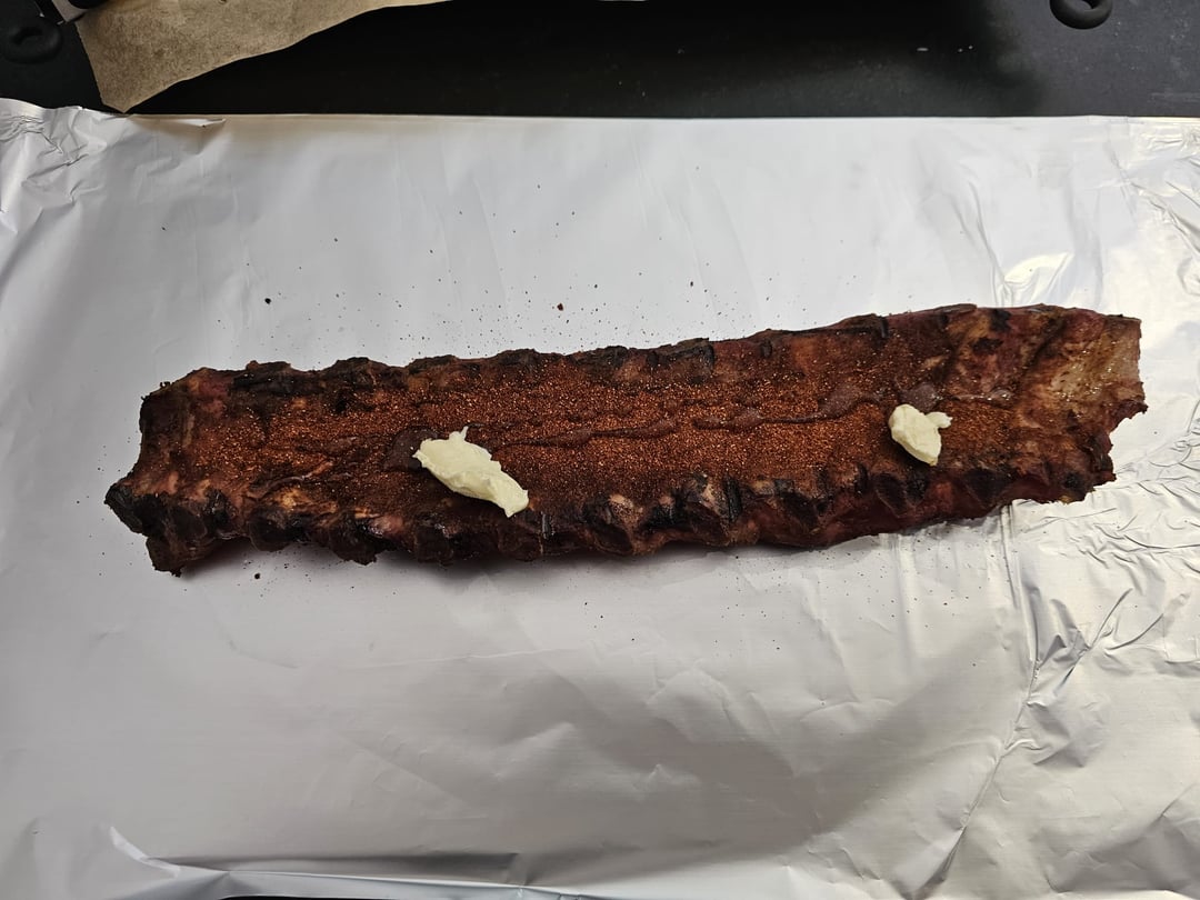 Smoked for 3 hours at 105°C/221°F then wrapped it in tinfoil for 1 hour and 40 minutes. Put a BBQ sauce on it and without tinfoil in the oven for 15 more minutes same temp.