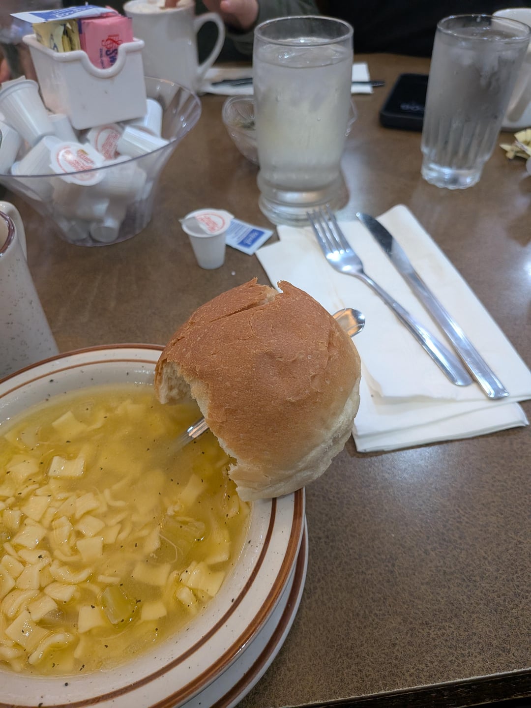 The soup is chicken noodle, the meal is a chicken kebab. The bread pictured is the amount I ate (my sister took a piece of it). Thank you! by LifeIsNoCabaret Dining and Cooking