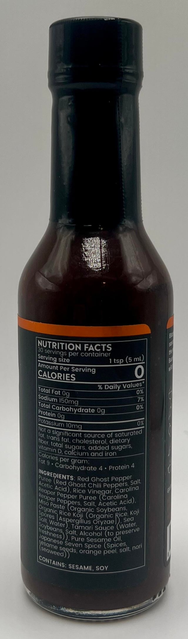 Ingredients: Red Ghost Pepper Puree (Red Ghost Chili Peppers, Salt, Acetic Acid), Rice Vinegar, Carolina Reaper Pepper Puree (Carolina Reaper Peppers, Salt, Acetic Acid), Miso Paste (Organic Soybeans, Organic Rice Koji (Organic Rice, Koji Spores [Aspergillus Oryzae]), Sea Salt, Water), Tamari Sauce (Water, Soybeans, Salt, Alcohol (to preserve freshness)), Pure Sesame Oil, Japanese Seven Spice (Spices, sesame seeds, orange peel, salt, nori (seaweed))