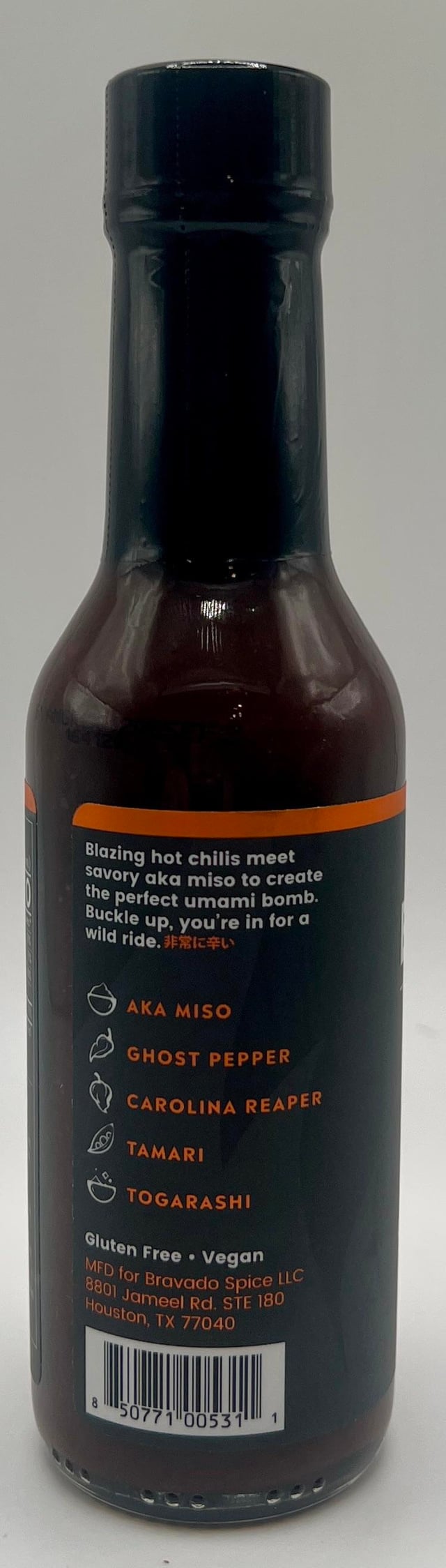 Bravado Spice Co out of Houston, TX was founded on the idea that a culinarily driven hot sauce company combined with slick marketing and label design was what the industry needed. I won’t deny that their black labels with shiny foil logos and their availability at Buc-cees, the Texas-based mega gas station has certainly been a key to their success, but we all know it’s what’s inside the bottle that matters most. After having previously enjoyed their umami-rich Black Garlic Carolina Reaper hot sauce I decided to try another super hot umami bomb from them – their Aka Miso Ghost-Reaper.