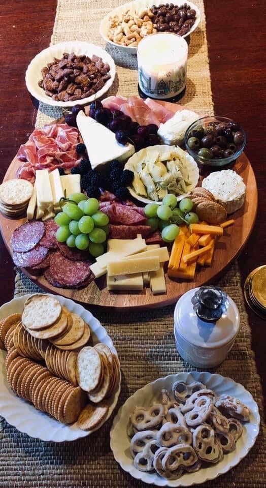 Using wooden boards, dishes, and bowls along with mixing fruit, nuts, assorted crackers, meats, sweets, and cheese makes a spread that looks abundant and luxurious. Pre-cut the hard cheese to make it easier for your guests. by DaphneRose-35 Dining and Cooking