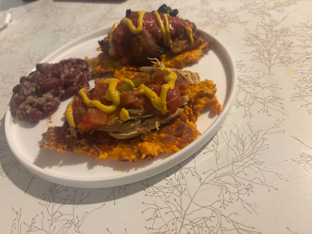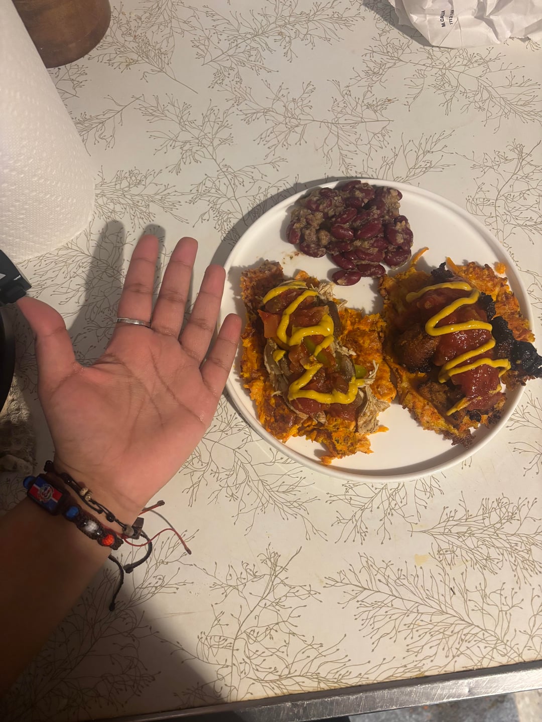 the left taco has pollo mechado which is basically boiled chicken breast and bell peppers, and the right one is air fried chicken thigh with a hot honey (subbed with agave) sauce, both have 1 tbsp of tostitos mild salsa and mustard and on the side is 1/4 cup of kidney beans with garlic.