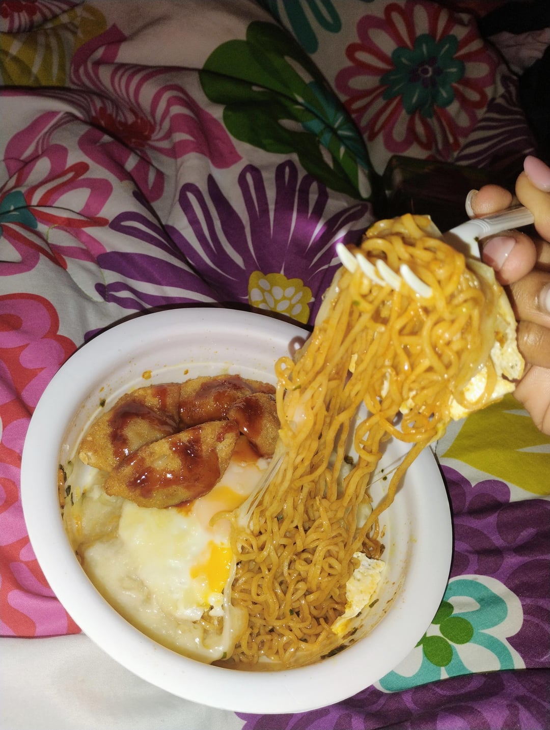 Had curry noodles w/ a egg and cheese, mini dumplings, matcha sponge cake and lychee drink 4 dinner