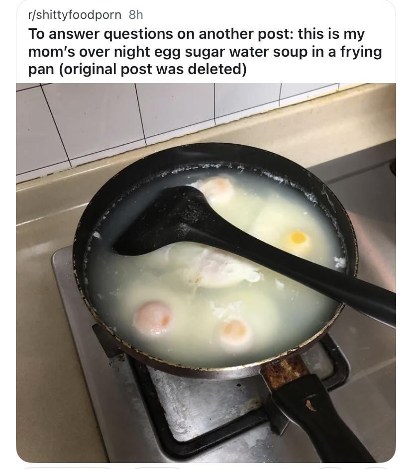 Djinjja-Ninja 4 weeks ago [The thread is wild.](https://www.reddit.com/r/shittyfoodporn/comments/1o3jyh2/to_answer_questions_on_another_post_this_is_my/)It’s apparently poached eggs, which then had sweetener added (not sugar, but sweetener because the intended ~~victim~~ consumer is diabetic), and left overnight in the stove top at room temp.[Maybe related to a Korean desert called Kai Wan](https://thailand1dollarmeals.com/2017/07/18/sweet-eggs-kai-wan-%E0%B9%84%E0%B8%82%E0%B9%88%E0%B8%AB%E0%B8%A7%E0%B8%B2%E0%B8%99/), except that uses actual sugar and importantly isn’t left to fester on the stove top overnight.edit: Jesus christ [this person needs locking up](https://www.reddit.com/r/shittyfoodporn/comments/1o3j1pb/is_my_mom_overreacting_or_is_my_new_slop_some/)