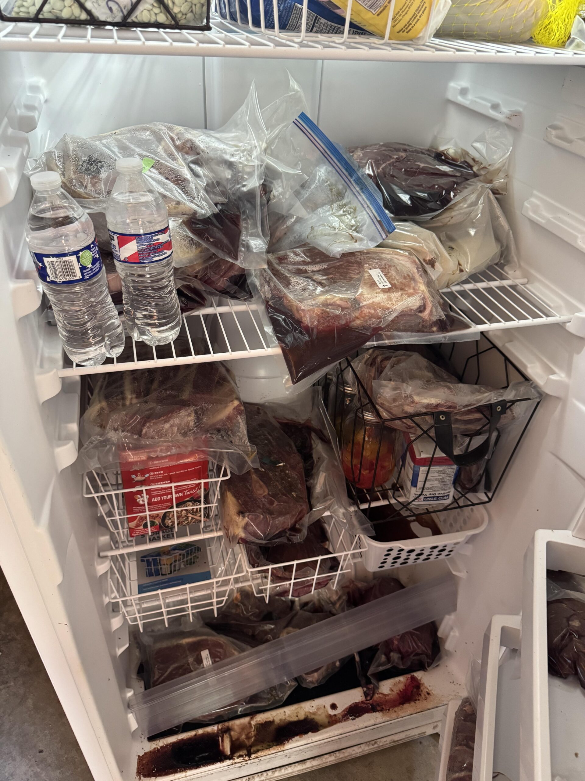 My meat freezer went out due to a faulty breaker. The ground beef was in another freezer but this is where all the prime cuts and roasts were. There was also a turkey and some other odds and ends.