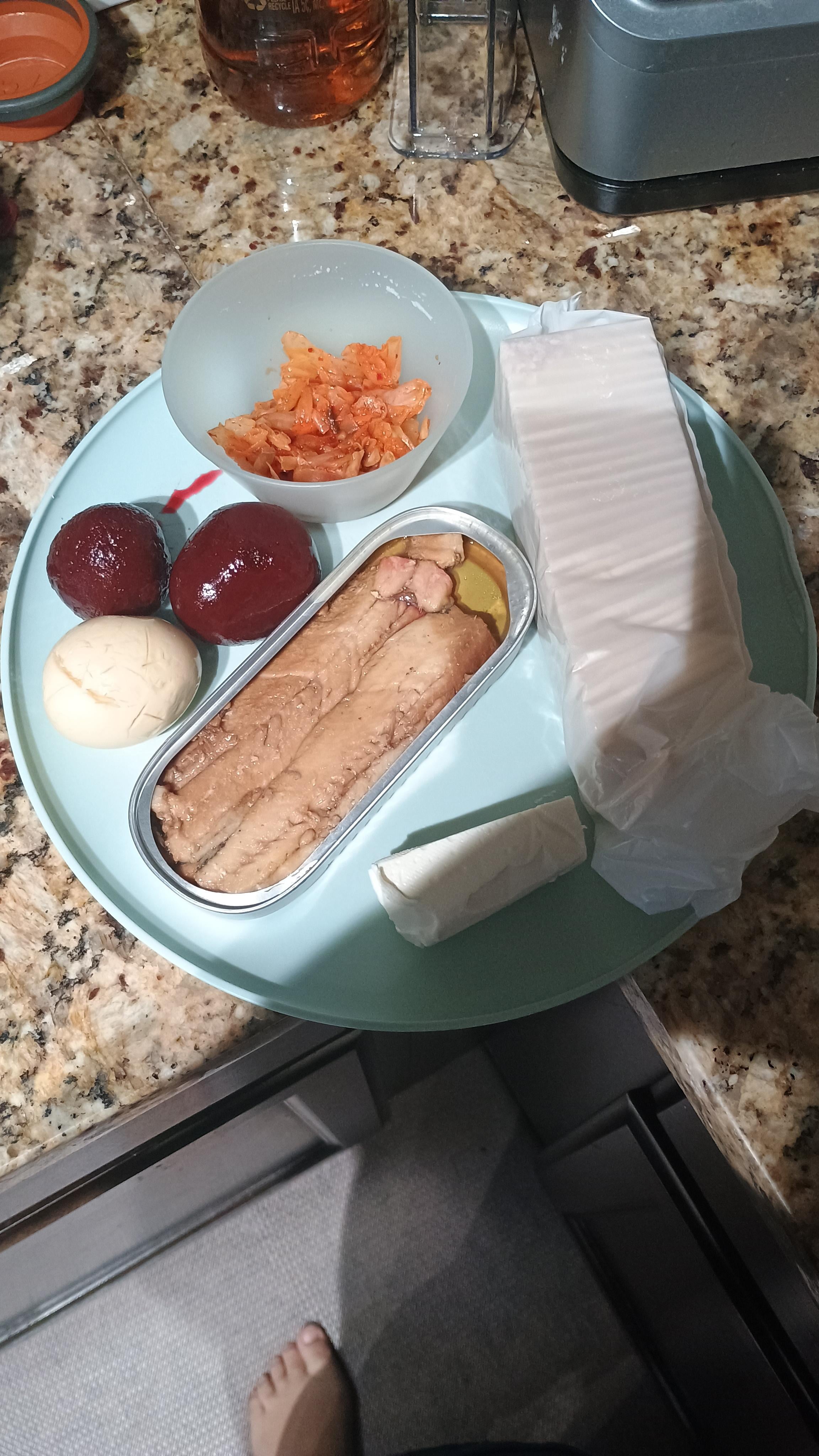 You ever have a plan for a nice large dinner snd youre excited then you get home and youre like hail naw. This is where rat girl dinner was made. Im finally trying my kipper snack for the first time. Have to say they are amazing smokey and good excited to try fancy ones as these are the cheap ones. And then all my favorite food pickeled eggs beets kimchi cream cheese (someone here said that is good with kippers) and saltines (i didnt have fancy crackers)